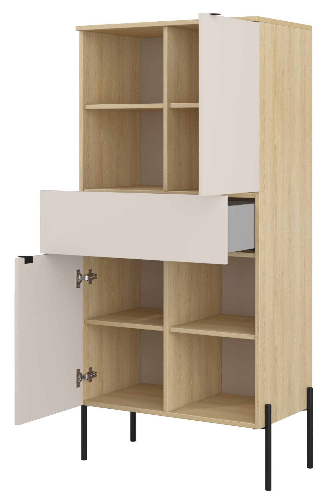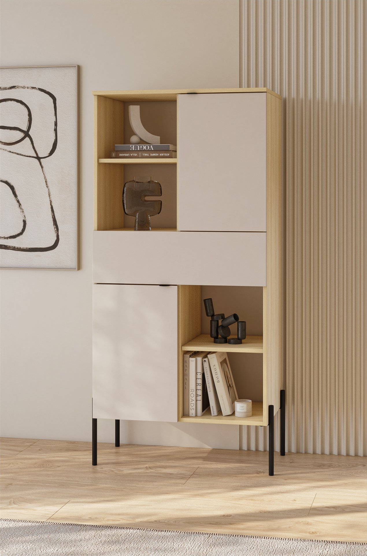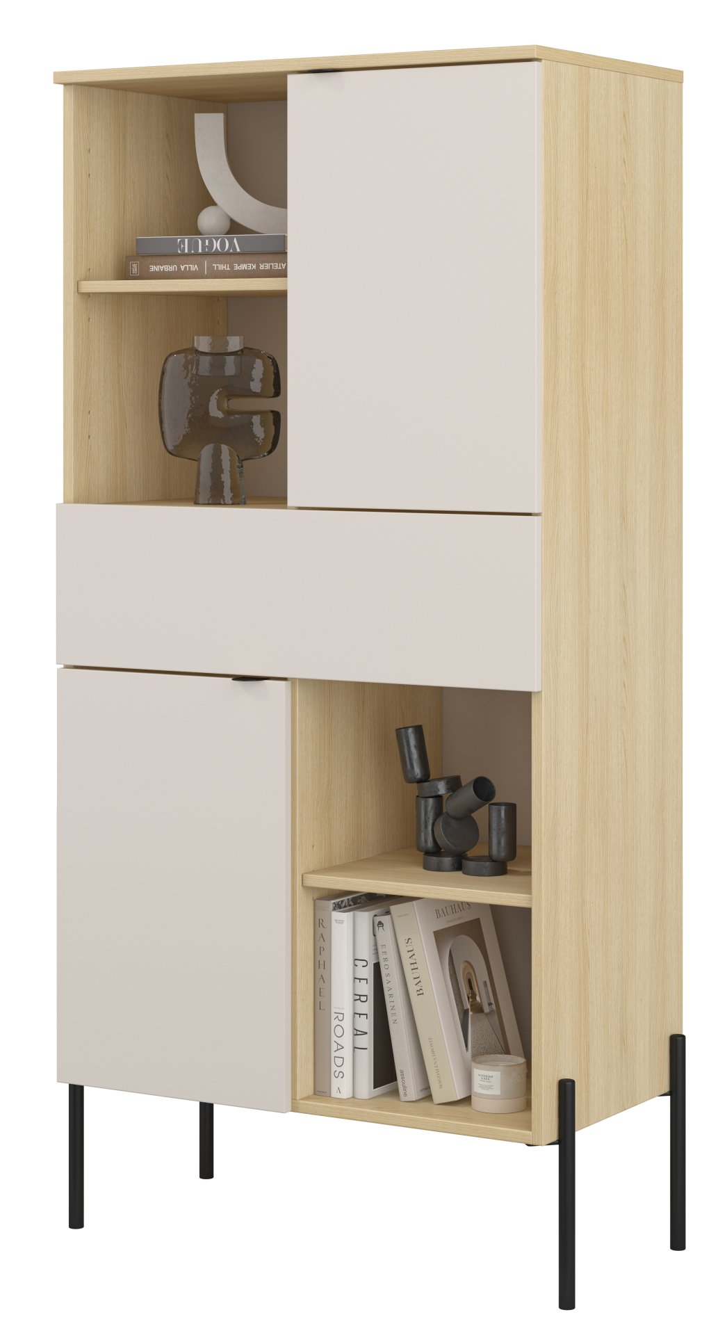 Osnova regala izrađena je od laminirane ploče debljine 15 mm, koja je otporna na ogrebotine i jednostavna za čišćenje. Površina u boji hrast lindberg naglašava prirodnu strukturu drva, dok nijansa kašmir na vratima i policama dodaje dašak suvremene mekoće. Kontrast između topline drva i hladnog tona kašmira stvara uravnotežen izgled koji se lijepo uklapa i u svjetlije i u tamnije interijere.