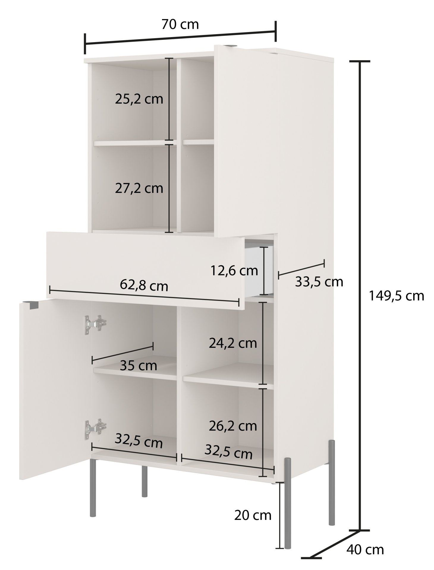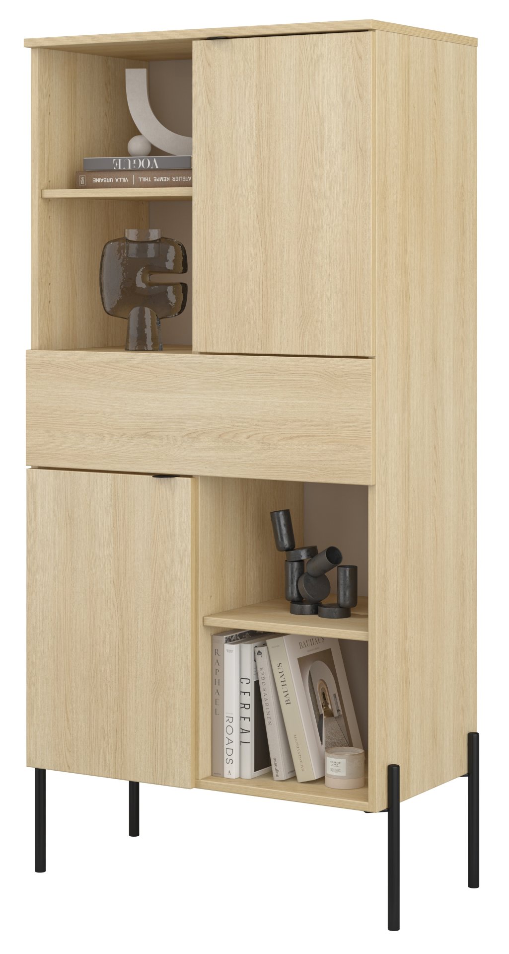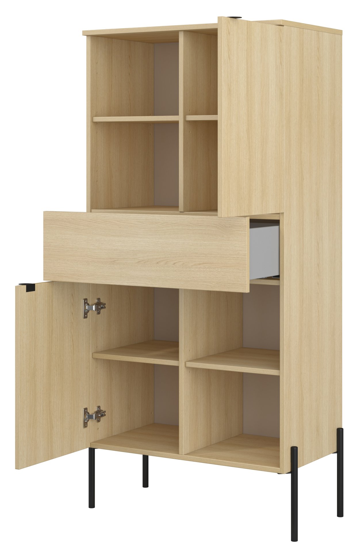 Regal Ore nudi dovoljno prostora za pohranu knjiga, dekorativnih predmeta ili osobnih dodataka. Metalne noge visine 270 mm (četiri komada) omogućuju jednostavno čišćenje poda ispod namještaja te vizualno olakšavaju strukturu. Plastične ručke su suptilne, ali praktične, jer dopunjuju cjelokupan izgled regala i omogućuju udobno otvaranje vrata ili ladica. Panti s mekanim zatvaranjem sprječavaju iznenadne udarce i osiguravaju tiho i glatko djelovanje.