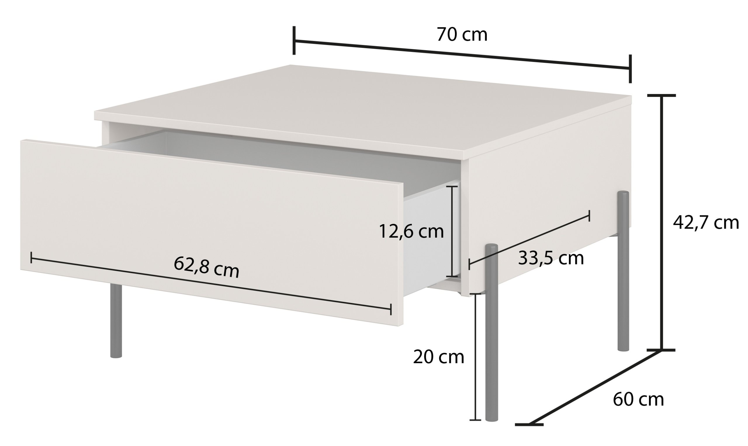 Njezine kompaktne mjere omogućuju jednostavno smještanje u manje dnevne sobe ili stanove, gdje je važna svaka površina. Unatoč svojoj veličini, nudi dovoljno prostora za posluživanje kave, pohranu knjiga ili dekorativnih predmeta. Zbog stabilne konstrukcije i promišljene visine, prikladna je i kao pomoćni stolić uz kauč ili naslonjač.