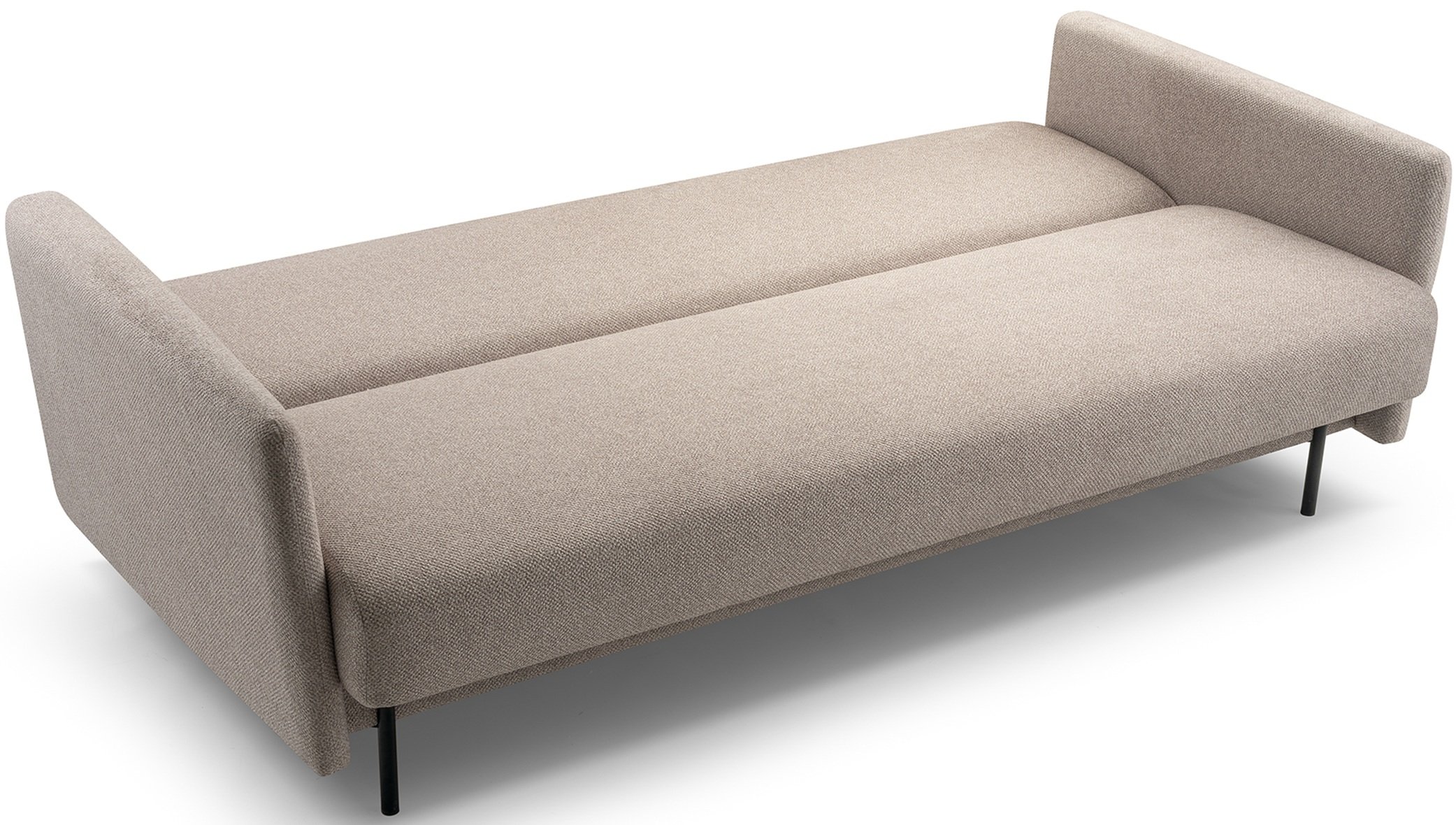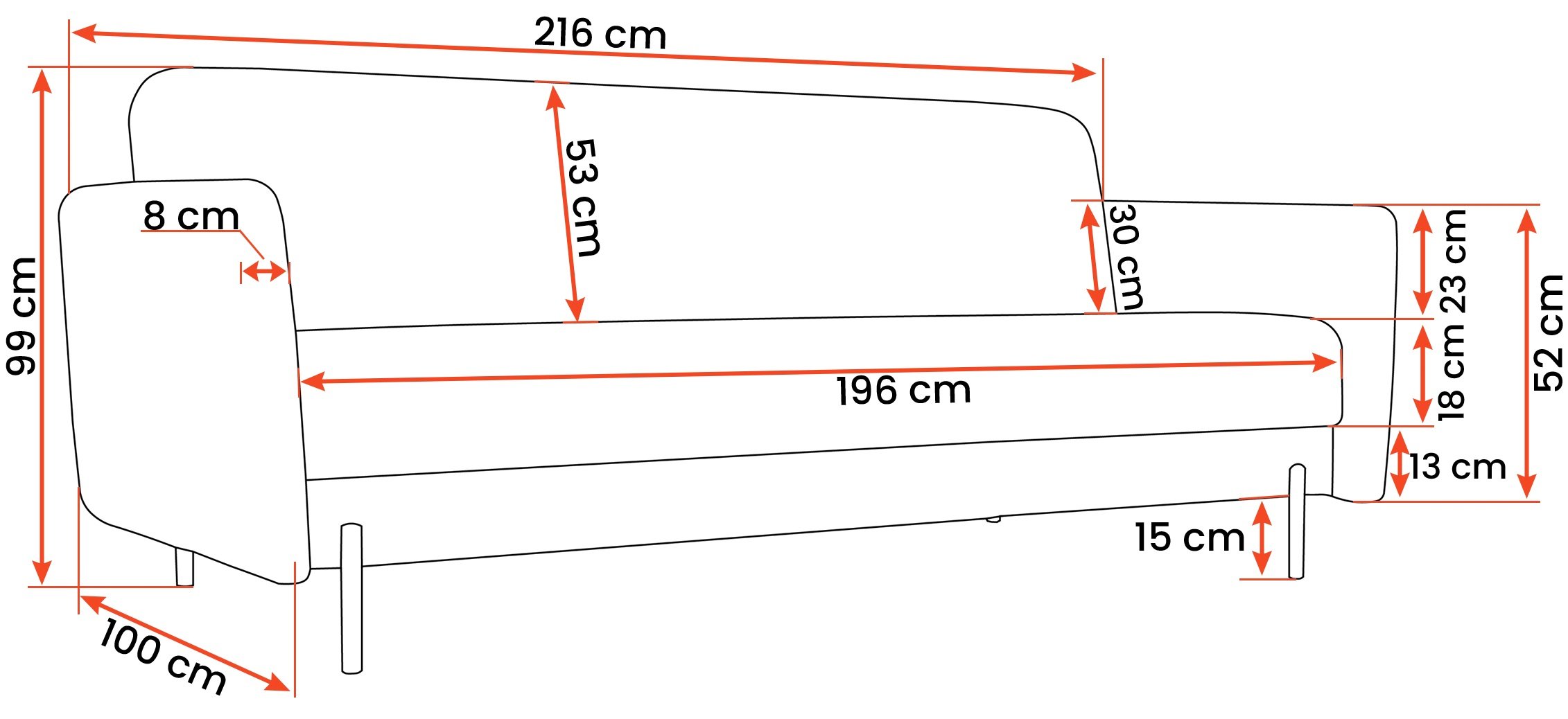 Ukupne dimenzije trosjeda iznose 216x100x99 cm, što omogućuje dovoljno prostora za udobno sjedenje triju osoba. Kada ga rasklopite, pretvara se u ležaj dimenzija 122x196 cm, što je dovoljno za ugodno prenoćište jedne ili dvije osobe. Širina prostora za spavanje je 120 cm, stoga je trosjed Rufi dobar izbor za manja stanovanja, sobe za goste ili dnevne prostore, gdje želite imati dodatnu mogućnost spavanja, a da pri tome ne žrtvujete prostor.