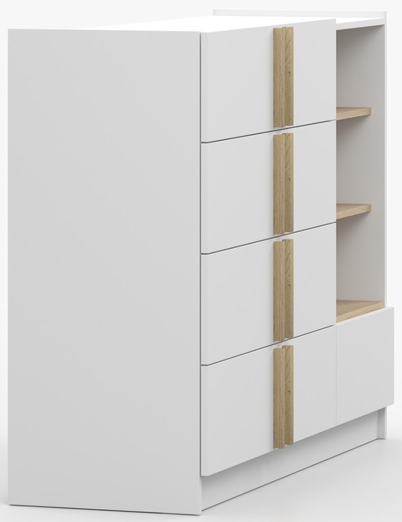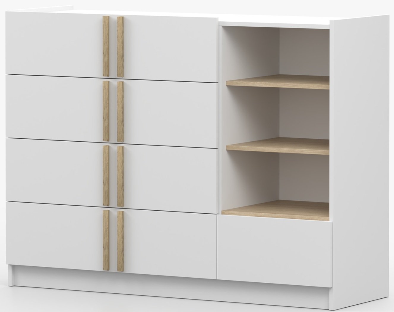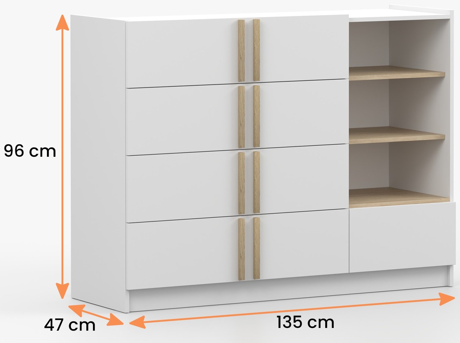 Materijal: laminirana ploča poznata je po svojoj otpornosti na trošenje i jednostavnom čišćenju, stoga je komoda Sevilla praktična za svakodnevnu upotrebu. Površina je glatka, ne upija vlagu i lako se održava vlažnom krpom. Bijela boja stvara dojam svježine i prostranosti, dok umetci u nijansi marvelie hrast dodaju toplinu i prirodnu teksturu. Ova kombinacija karakteristična je za suvremeni skandinavski stil koji se lijepo uklapa s brojnim drugim bojama i materijalima u unutarnjem uređenju.