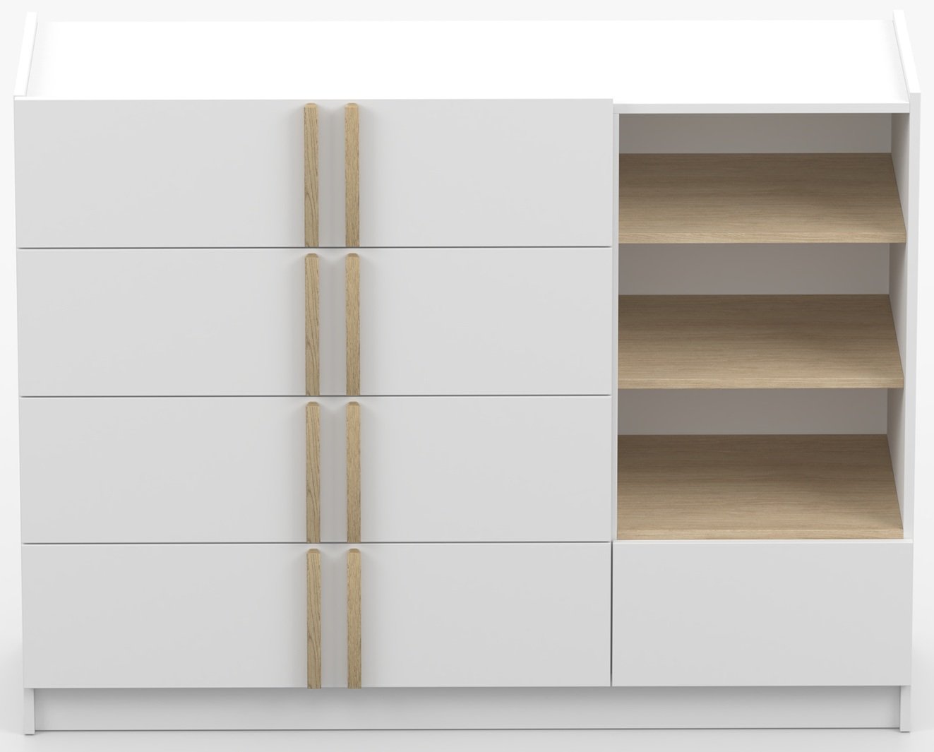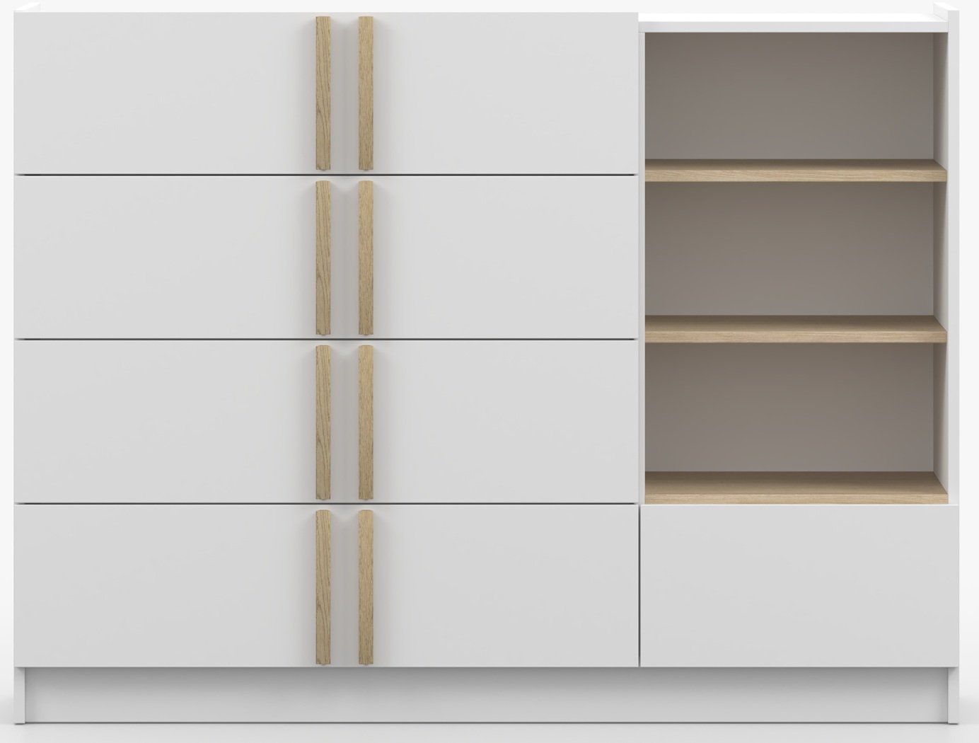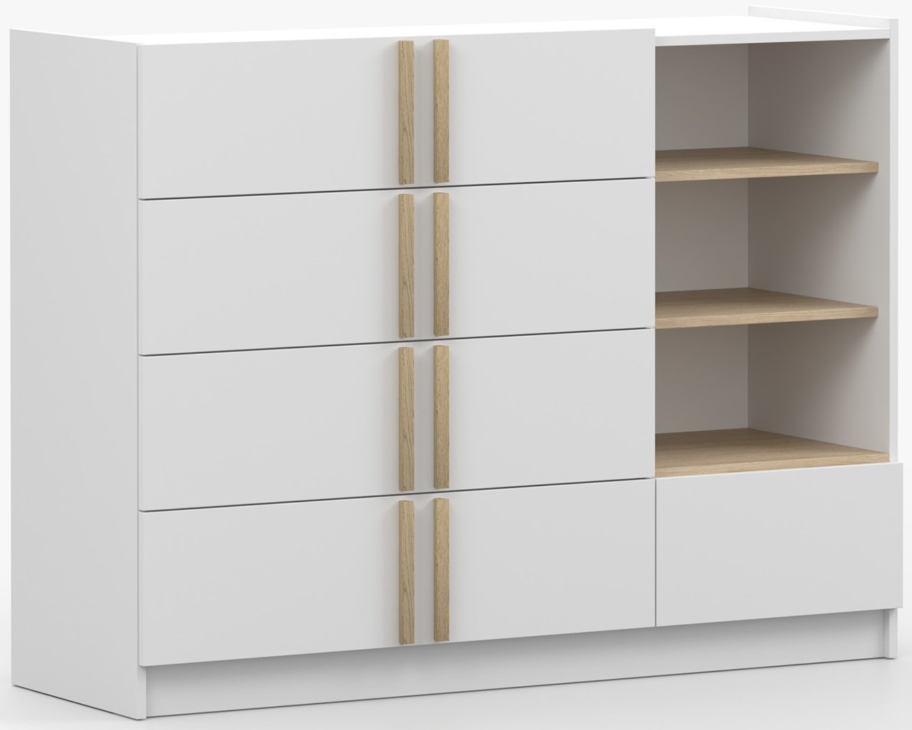 Materijal: laminirana ploča poznata je po svojoj otpornosti na trošenje i jednostavnom čišćenju, stoga je komoda Sevilla praktična za svakodnevnu upotrebu. Površina je glatka, ne upija vlagu i lako se održava vlažnom krpom. Bijela boja stvara dojam svježine i prostranosti, dok umetci u nijansi marvelie hrast dodaju toplinu i prirodnu teksturu. Ova kombinacija karakteristična je za suvremeni skandinavski stil koji se lijepo uklapa s brojnim drugim bojama i materijalima u unutarnjem uređenju.