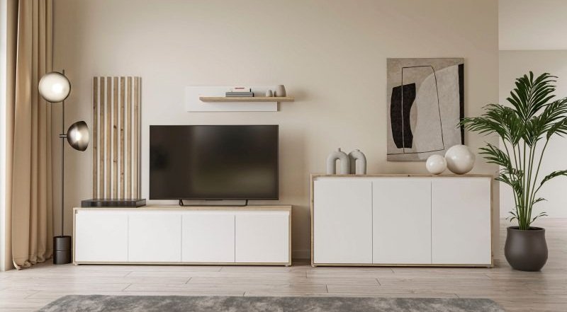 2. Praktičan raspored: sastavljen od komode, TV ormarića i police, dnevni boravak Skelpe nudi dovoljno prostora za pohranu i izlaganje vaših omiljenih predmeta. Komoda je idealna za spremanje dokumenata ili osobnih stvari, dok TV ormarić omogućuje uredan raspored svih vaših multimedijskih uređaja. Polica je savršena za knjige, dekoracije ili obiteljske fotografije.