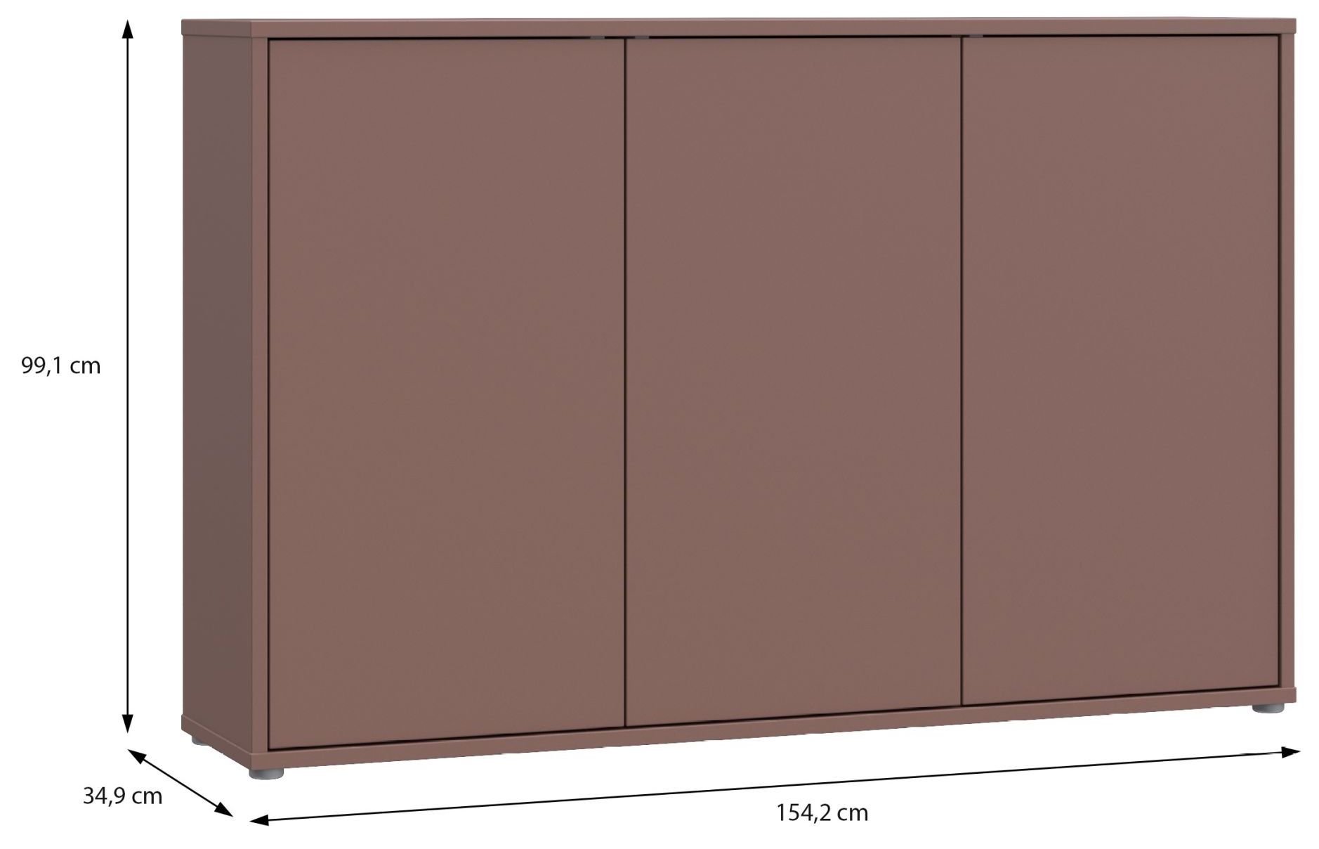Dimenzije 154 cm u širinu, 35 cm u dubinu i 99 cm u visinu omogućuju optimalan raspored unutarnjeg prostora. Komoda nudi dovoljno prostora za pohranu tekstila, dokumenata ili manjih kućanskih predmeta. Zbog svoje visine gornja ploča može se koristiti i kao površina za izlaganje dekorativnih elemenata poput vaza, svjetiljki ili fotografija.