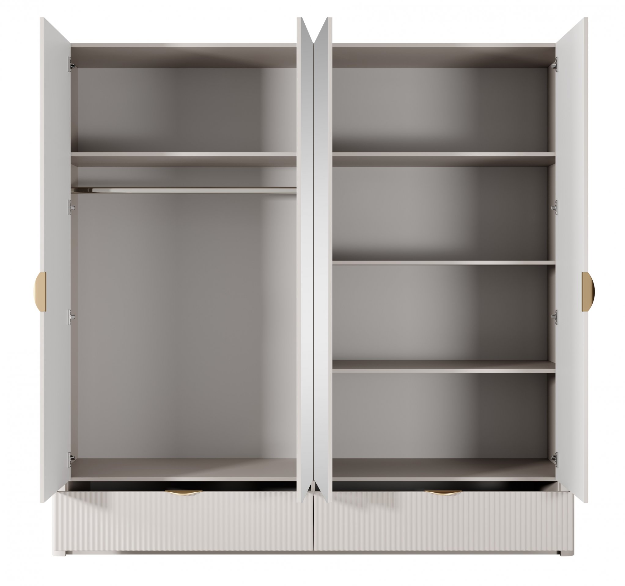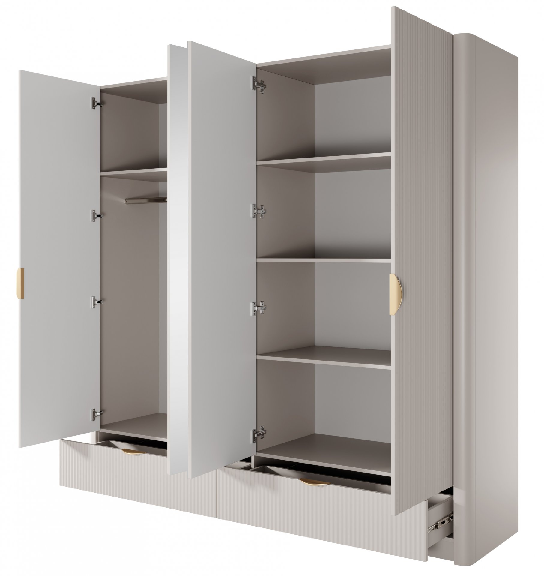 Tehnologija mekog zatvaranja (soft close) omogućuje tiho i nježno zatvaranje vrata bez neželjenog udarca, produžujući vijek trajanja mehanizama i čineći korištenje ugodnijim. Posebno dizajnirani šarkovi omogućuju paralelno ili dvostruko otvaranje vrata, olakšavajući pristup svim dijelovima unutrašnjosti. Zahvaljujući promišljenom rasporedu polica i pregrada, svaki komad odjeće pronalazi svoje mjesto, a prostor ostaje uredan i pregledan.