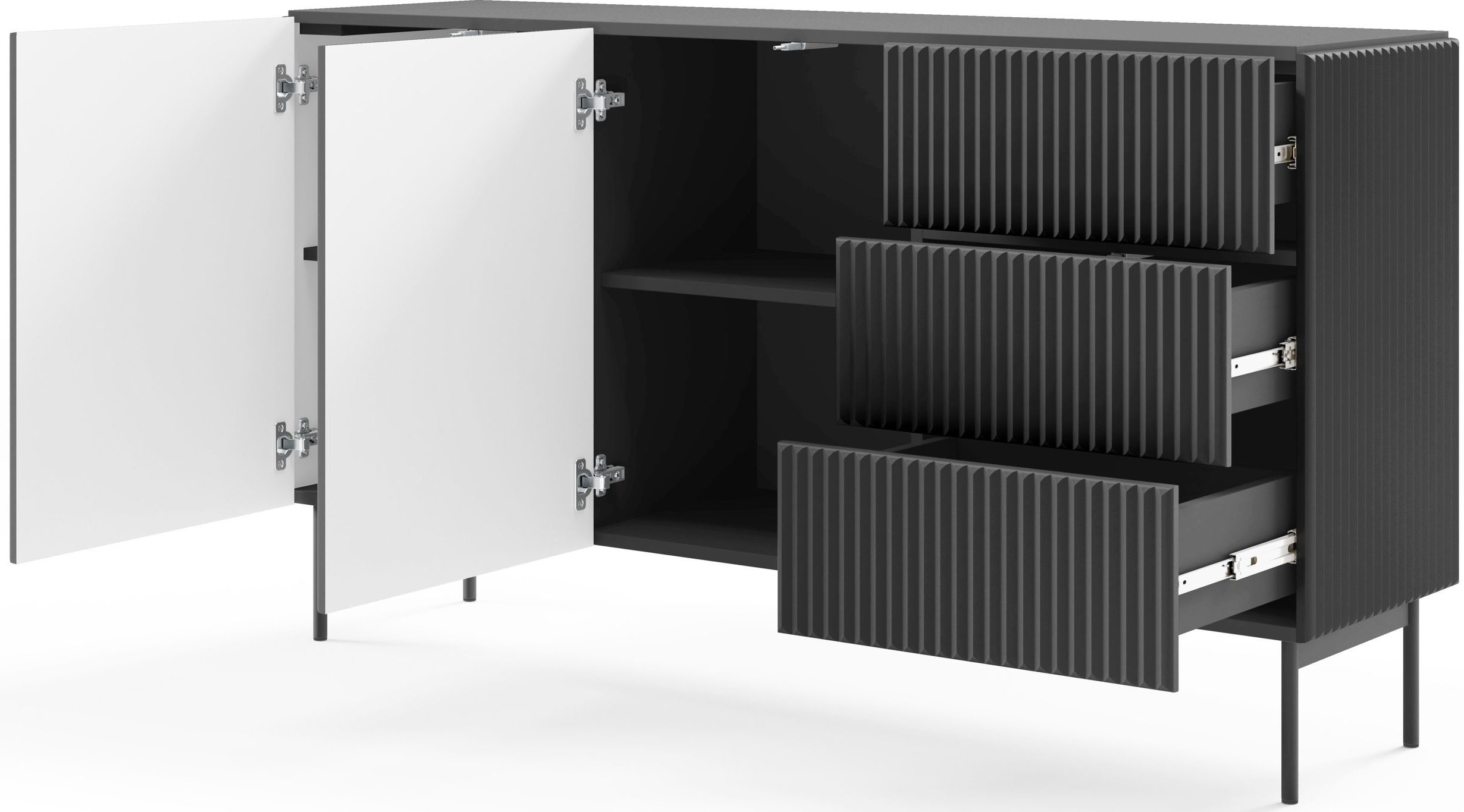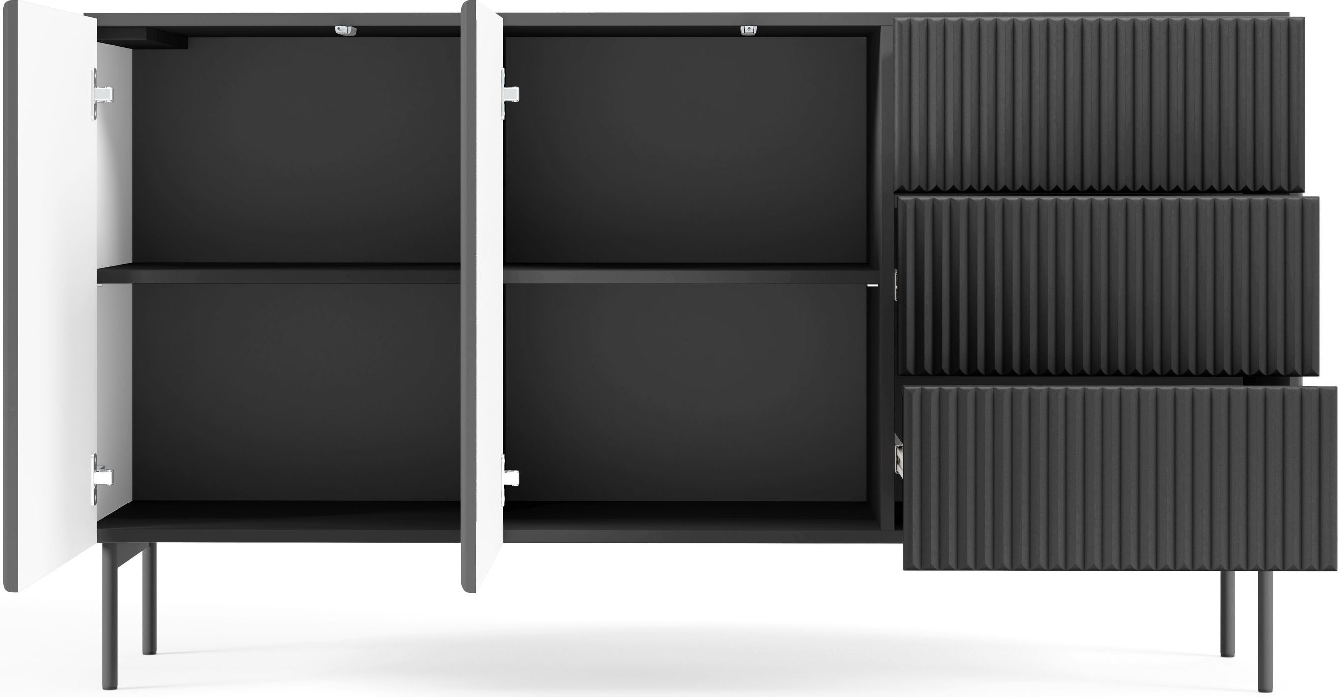 Komoda je dizajnirana s mišlju na jednostavnu upotrebu i maksimalno iskorištenje prostora. Otvaranje se odvija bez ručki, pomoću suvremenog push-to-open mehanizma koji omogućuje lako i tiho otvaranje vrata i ladica laganim pritiskom. Ladice su opremljene kugličnim vodilicama s punim izvlačenjem, što znači da imate potpun pristup unutrašnjosti bez nepotrebnog saginjanja ili traženja po skrivenim kutovima. Vrata su postavljena na dvostruke šarke, što povećava stabilnost i izdržljivost.