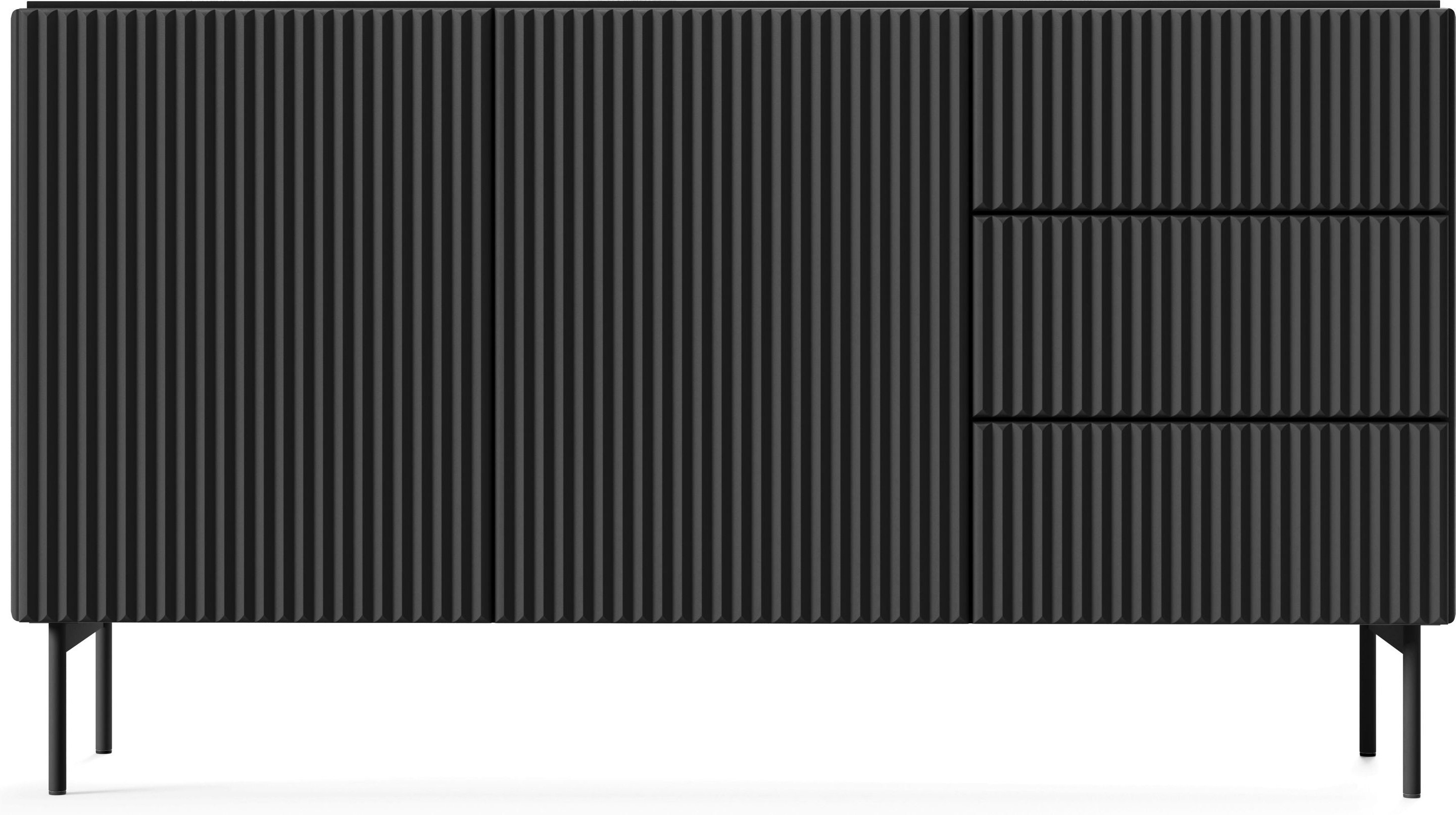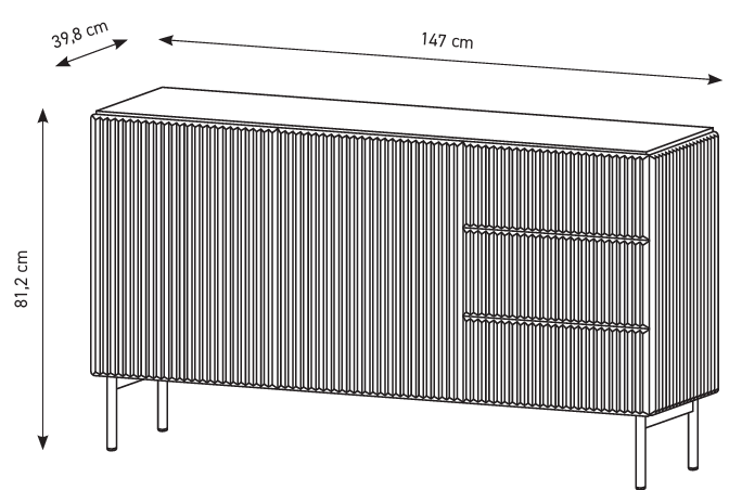 Elegantna i suvremena komoda u crnoj boji savršen je izbor za sve koji žele spojiti funkcionalnost, kvalitetu i bezvremenski dizajn. Svojim dimenzijama 147 x 39,8 x 81,2 cm nudi obilje prostora za pohranu, a istovremeno profinjenim linijama i minimalističkim izgledom upotpunjuje svaki moderan interijer. Izrađena je od visokokvalitetne utorene MDF ploče debljine 18 mm te laminirane iverice debljine 16 mm, što osigurava čvrstoću, stabilnost i dug vijek trajanja.