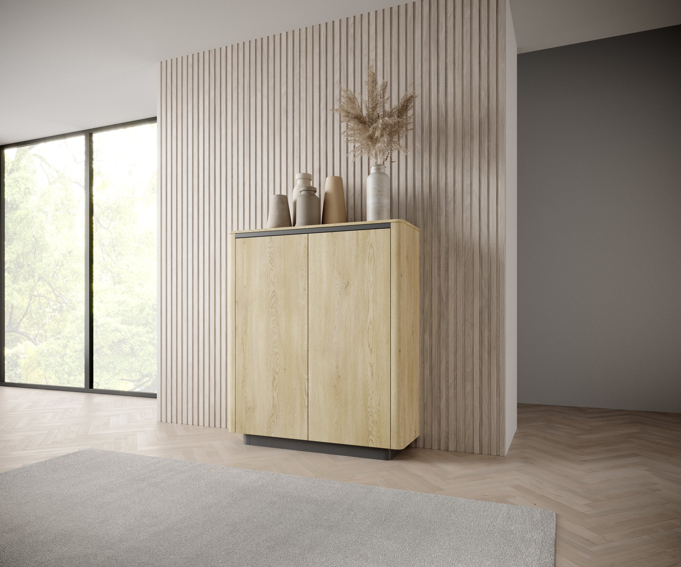 Bez obzira želite li u prostor unijeti više topline s prirodnim nijansama drva ili stvoriti kontrastan, suvremen izgled, ova visoka komoda savršeno se snalazi u oba scenarija. Zbog svoje visine i uže dubine ne zauzima mnogo prostora, ali nudi maksimalnu funkcionalnost. Može stajati kao samostalan dizajnerski element ili se povezati s ostalim komadima namještaja iz iste linije za usklađen izgled.