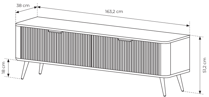 Dimenzije 163.2x38x51,2 cm omogućuju da komoda pruži dovoljno prostora za vaš televizor, medijske uređaje i dekorativne dodatke, a pritom ne zauzima previše prostora. Čiste linije i svijetla boja stvaraju osjećaj prostranosti, što je posebno važno u manjim dnevnim sobama ili stanovima. Dizajn omogućava jednostavno uklapanje u različite interijere, jer bijela boja odlično pristaje uz drvo, metal ili šarene dodatke.