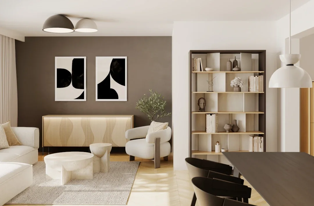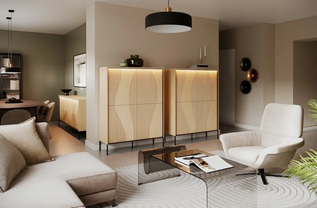 Dnevni boravak Flow osmišljen je tako da omogućuje optimalno korištenje prostora u različitim tipovima stanova. Bez obzira radi li se o prostranom dnevnom boravku ili manjem stambenom prostoru, elementi sastava međusobno se skladno nadopunjuju. Zbog neutralne palete boja Flow se lijepo uklapa s različitim podnim oblogama – od svijetlog parketa do tamnih vinilnih podova. Prilagodljivost elemenata omogućuje individualan raspored, što znači da možete stvoriti i klasičan ravni raspored uz zid i suvremenu kombinaciju s otvorenim policama i zatvorenim ormarićima.