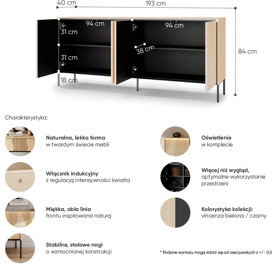 Kućište komode izrađeno je od laminirane iverice debljine 16 mm, koja osigurava čvrstoću i otpornost na svakodnevna opterećenja. Prednji dijelovi izrađeni su od kvalitetne MDF ploče debljine 18 mm, što omogućuje preciznu obradu i glatku površinu. Površina je jednostavna za čišćenje i održavanje, što doprinosi dugom vijeku trajanja proizvoda. Kombinacija boja izbjeljenog hrasta Vincenza i crne boje osigurava svjež, ali sofisticiran izgled. Ova kombinacija svijetlog drva i tamnih detalja naglašava geometriju komode te joj daje karakter suvremenog namještaja.