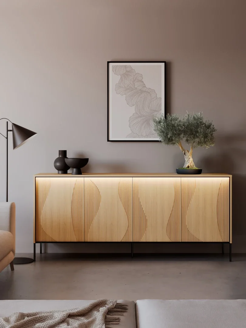 Komoda Flow FW-04 nije ograničena samo na dnevne sobe. Njezin neutralni koloristički plan omogućuje upotrebu i u spavaćoj sobi kao garderobna komoda ili u hodniku kao dodatna površina za odlaganje. U kombinaciji s drugim elementima iz iste kolekcije možete stvoriti usklađen izgled cijelog stana. Komoda se zbog svoje visine izvrsno pokazuje i kao postolje za dekorativne elemente, ogledala ili manje svjetiljke.