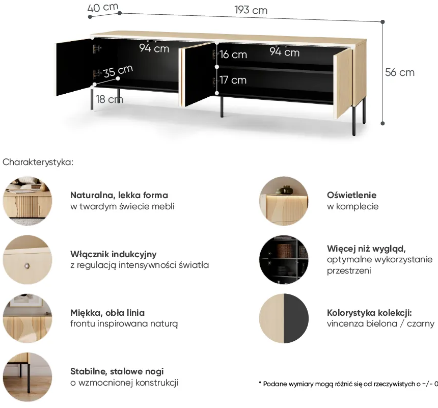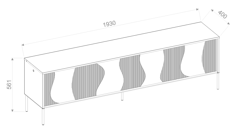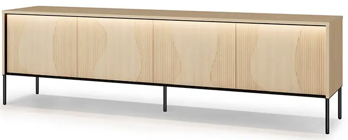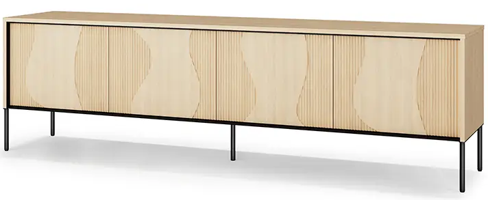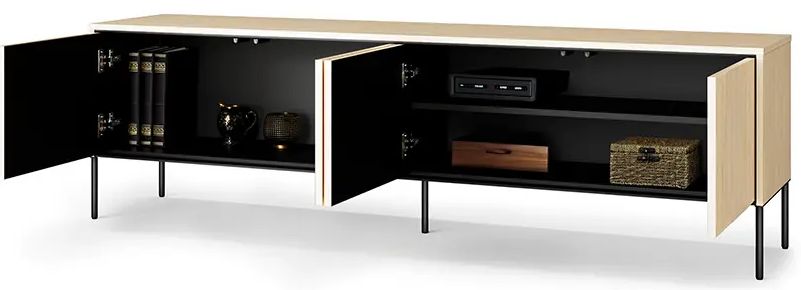 TV komoda mjeri 193x40x57 cm, što nudi dovoljno prostora i za televizor i za dodatnu multimedijsku opremu. Dizajn uključuje četvera prostrana vrata iza kojih se skriva organiziran unutarnji prostor. On je prikladan za pohranu različitih predmeta – od audio-video uređaja, kablova i daljinskih upravljača do dokumenata ili dekorativnih dodataka. Zahvaljujući diskretnom zatvaranju, sadržaj i kablovi uvijek su uredno pospremljeni, a dnevna soba ostaje uredna i estetski dovršena.