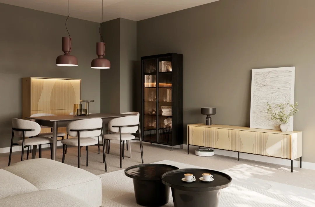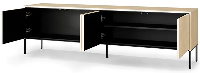 Tanke crne noge daju komodi lakoću i vizualnu prozračnost, a istovremeno omogućuju jednostavno čišćenje poda ispod nje. Kombinacija svijetlog drva i tamnih naglasaka stvara harmoničan kontrast koji djeluje ugodno i uravnoteženo. Komoda se tako bez poteškoća uklapa u različite ambijente – i u moderne i u klasičnije dnevne sobe.