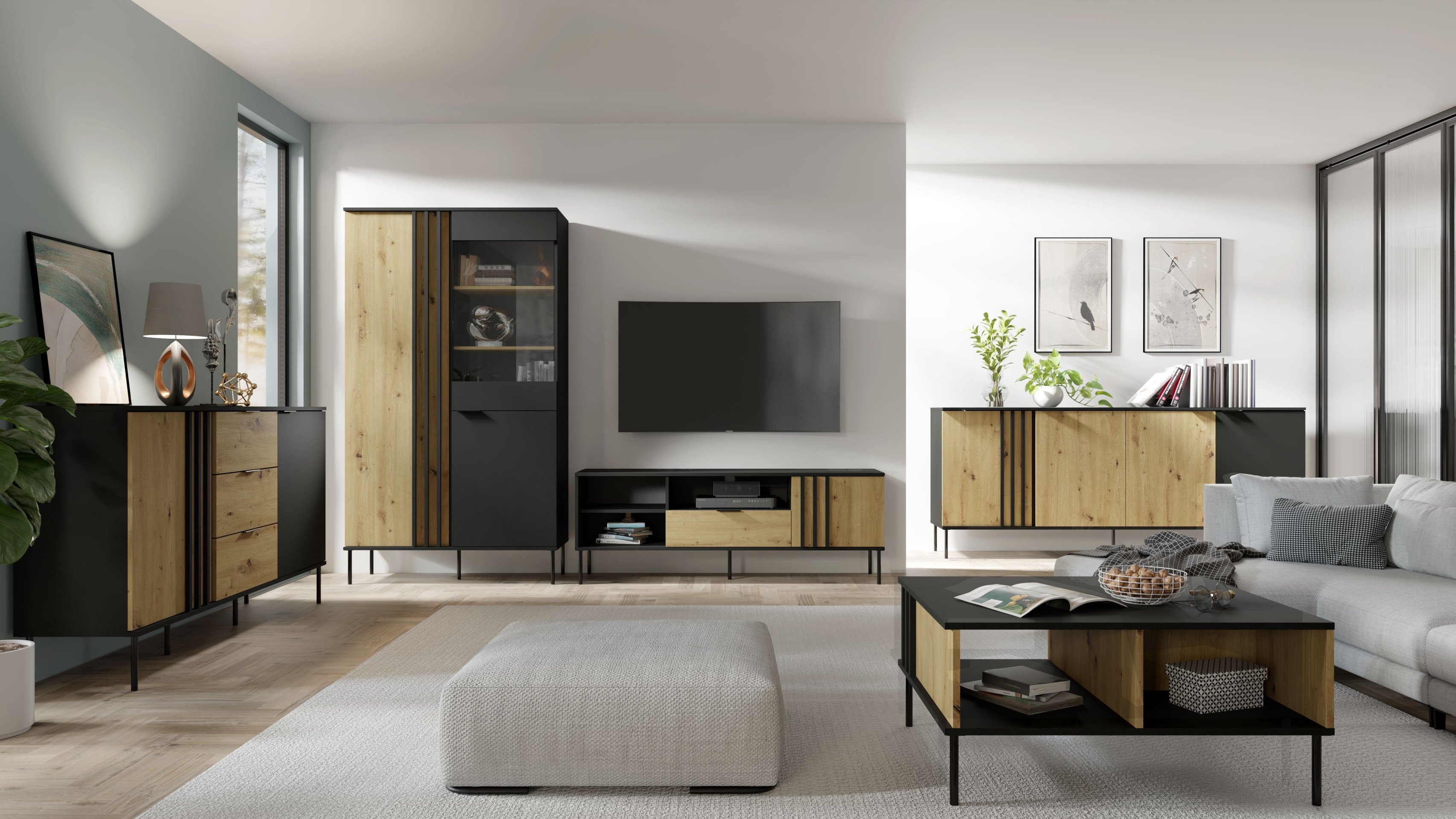 Savršena kombinacija elegancije i funkcionalnosti za vaš dom – ova moderna sastavljena dnevna soba i blagovaonica očarat će svojim minimalističkim, a istovremeno toplim dizajnom. Povezuje profinjenu crnu boju s prirodnom nijansom hrasta artisan, što stvara harmoničan kontrast koji se savršeno uklapa i u manji i u veći stan. Pažljivo odabrani materijali i dorađeni detalji osiguravaju ugodan boravak i prijatnu atmosferu u prostoru.