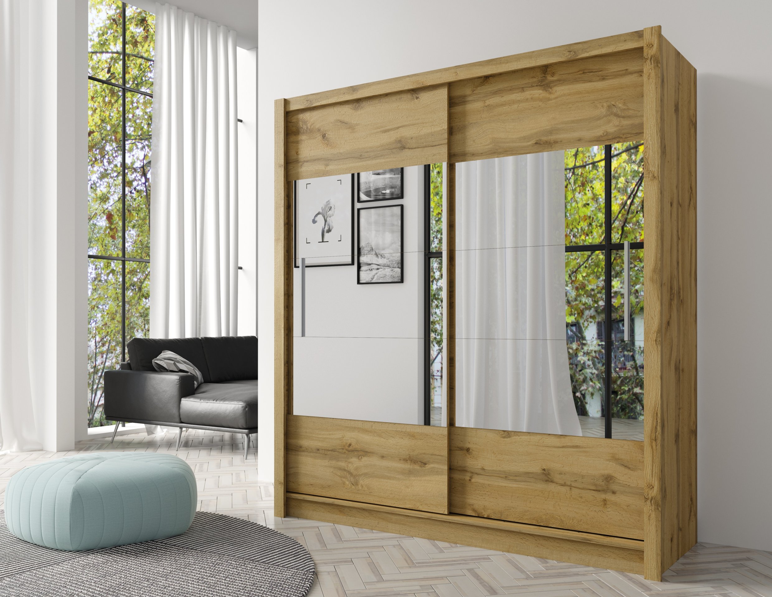 Priuštite si garderobni ormar s kliznim vratima i ogledalom u boji hrasta votan te stvorite prostor gdje se funkcionalnost susreće s elegancijom.