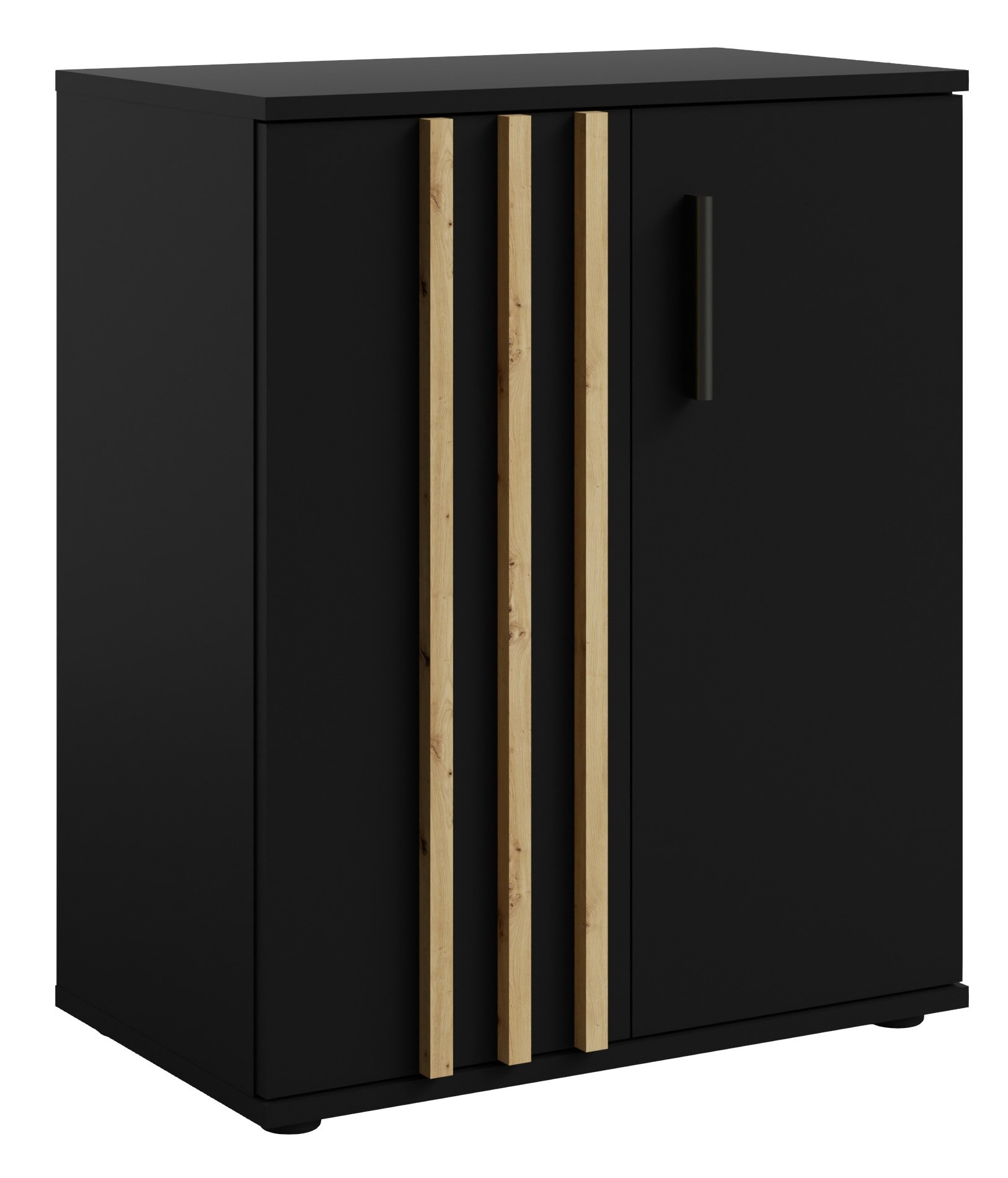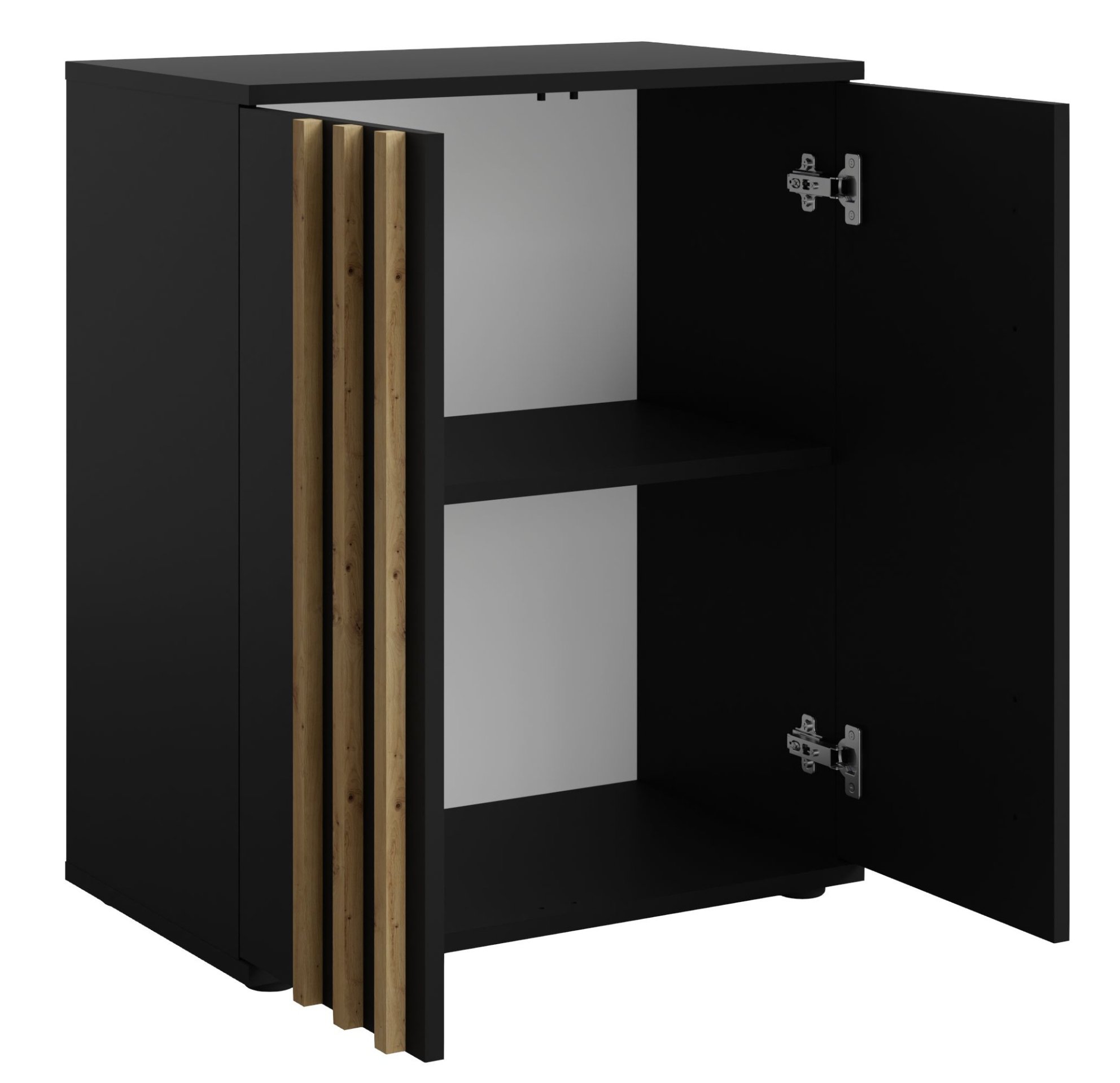 Glavna prednost ove komode je njezina kombinacija estetike i uporabnosti. Korpus i fronte izrađeni su od visokokvalitetne laminirane ploče debljine 16 mm, što osigurava čvrstoću i dug vijek trajanja. Dekorativne MDF letvice u drvenom tonu hrasta artisan stvaraju ugodan kontrast s crnom pozadinom, pa se komad namještaja lijepo uklapa i u moderne i u klasičnije interijere. Stražnja stijenka od HDF ploče je lagana, ali stabilna, što dodatno pridonosi pouzdanosti konstrukcije.