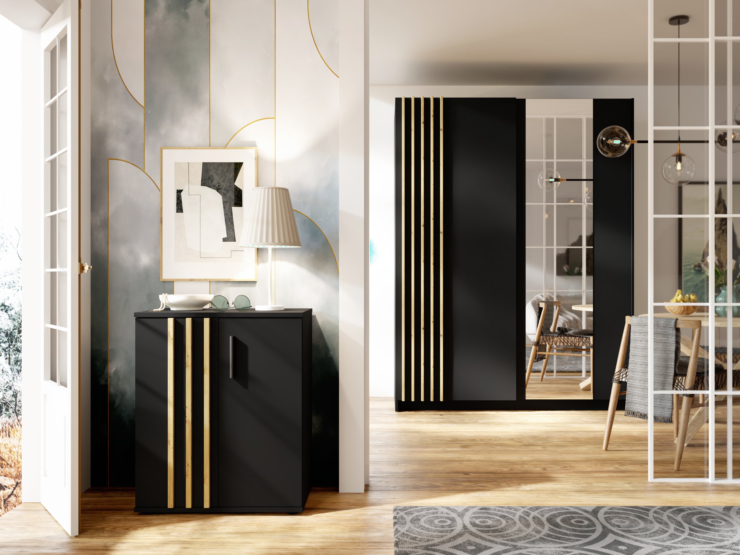 Crna komoda s detaljima u boji hrasta artisan više je od samog prostora za pohranu – to je komad namještaja koji naglašava karakter prostora. U suvremenim interijerima ističe se kao elegantna točka, a u klasičnima stvara ugodan kontrast. Posebno se lijepo slaže s dodacima u prirodnim tonovima, metalnim elementima ili svjetlijim drvenim površinama. Na gornju policu možete postaviti dekorativne elemente poput vaza, okvira za slike ili sobnih biljaka, čime stvarate ugodnu i osobnu atmosferu.