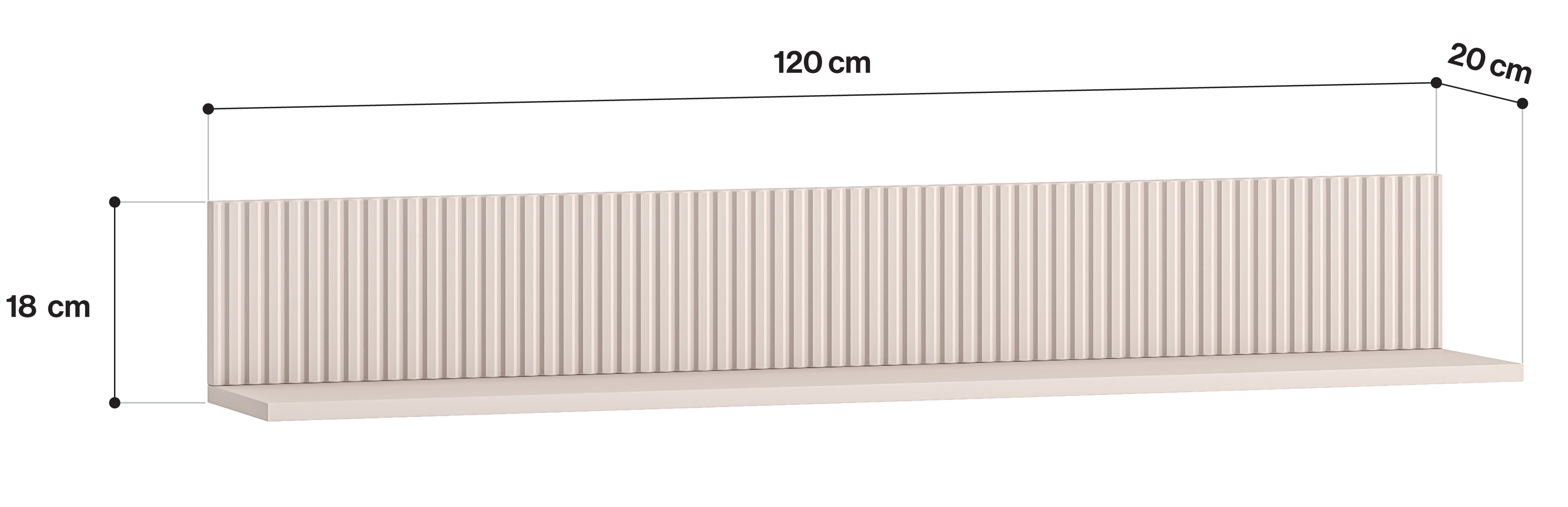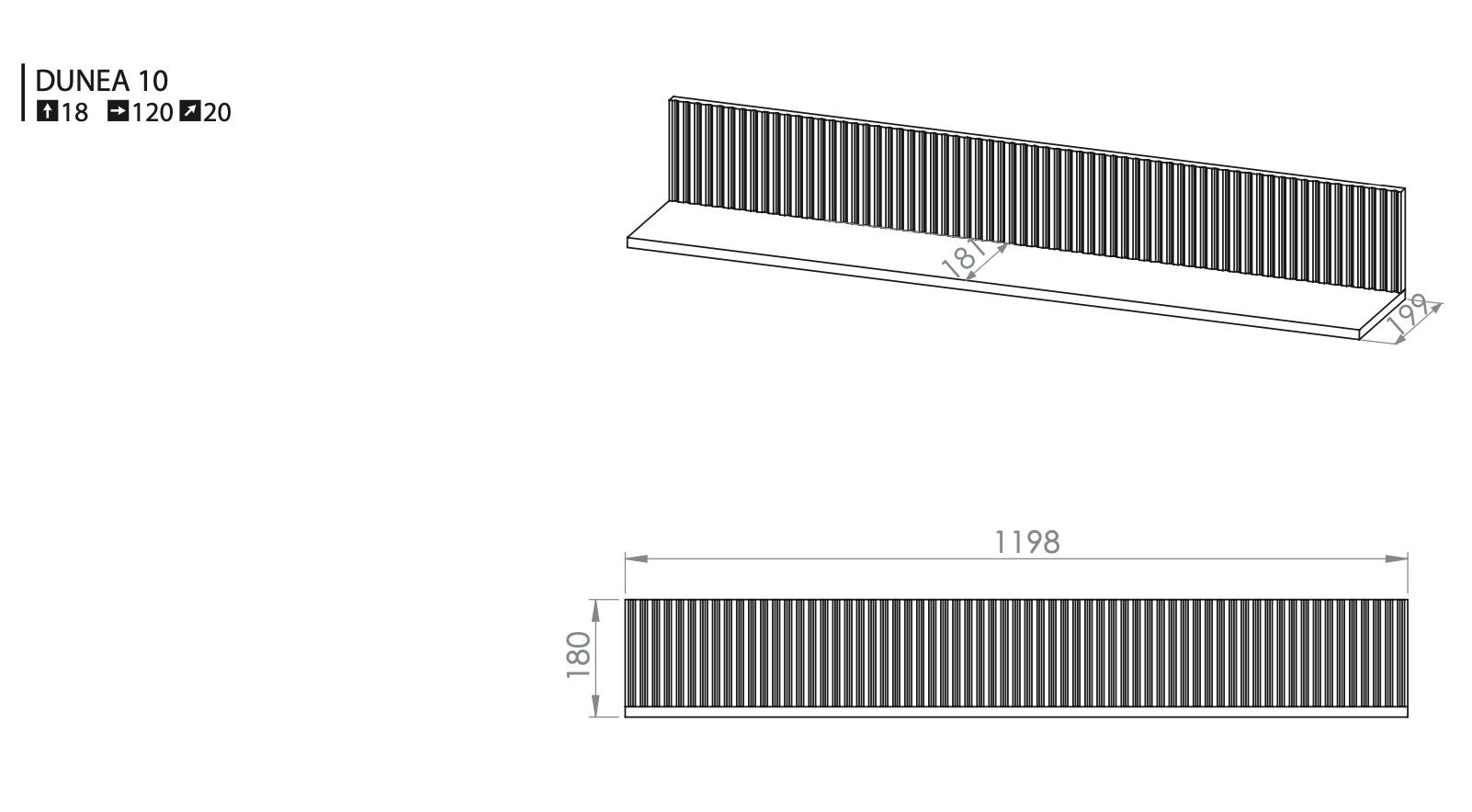 Zidna polica Dunea savršena je kombinacija estetike i funkcionalnosti koja će obogatiti svaki prostor u vašem domu. S dimenzijama 120x20x18 cm elegantno se uklapa u sve tipove interijera, od suvremenih do klasičnih. Izrađena je od kvalitetnih materijala, poput MDF-a i laminirane iverice, što osigurava dugotrajnost i otpornost na svakodnevnu upotrebu.