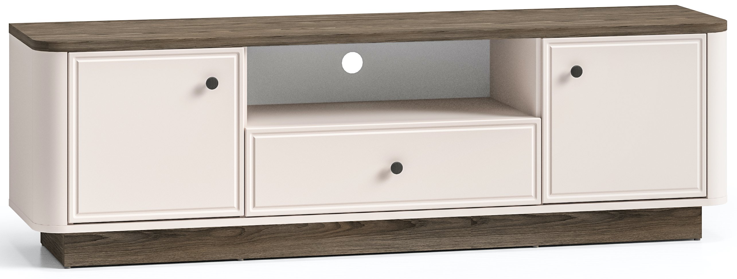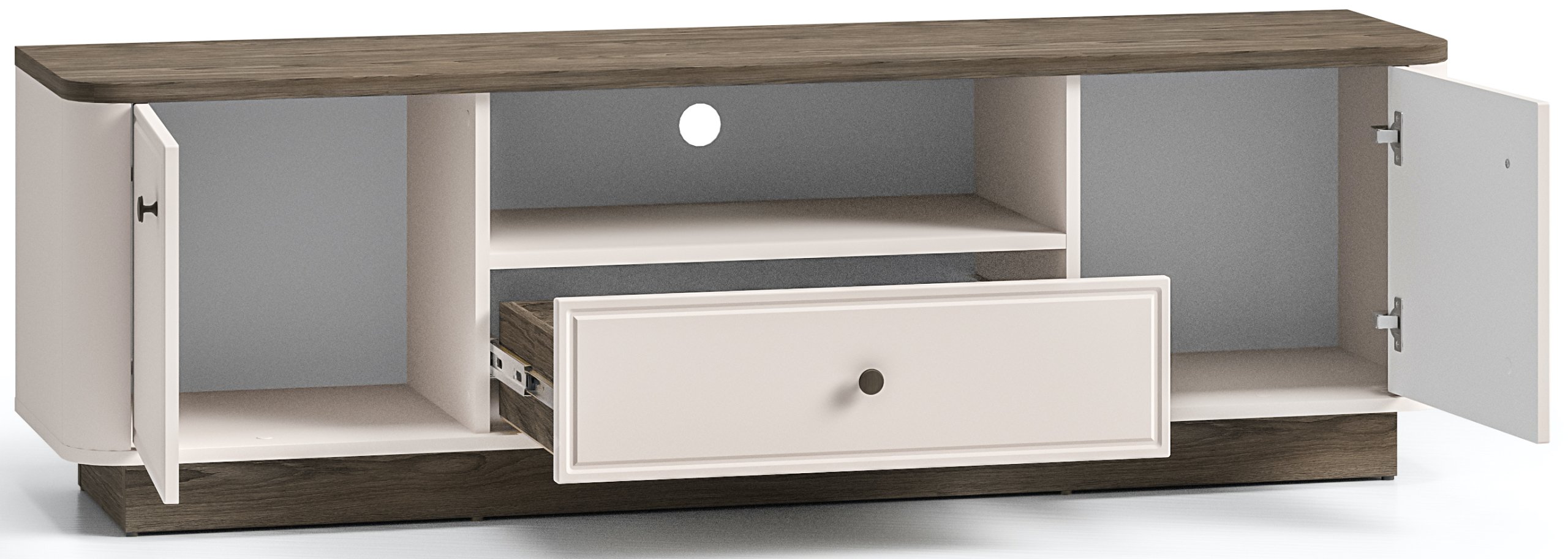 Elegantno zaobljeni rubovi ublažavaju linije komode i vizualno je povezuju s ostalim elementima namještaja. Takva obrada ne doprinosi samo estetici, nego i sigurnosti uporabe – osobito u prostorima gdje se kreću djeca. Oblik komode temelji se na pravilnim geometrijskim omjerima, što stvara osjećaj reda i ravnoteže u prostoru. Profinjen kontrast boja i materijala upotpunjen je harmoničnim rasporedom otvorenih i zatvorenih površina.