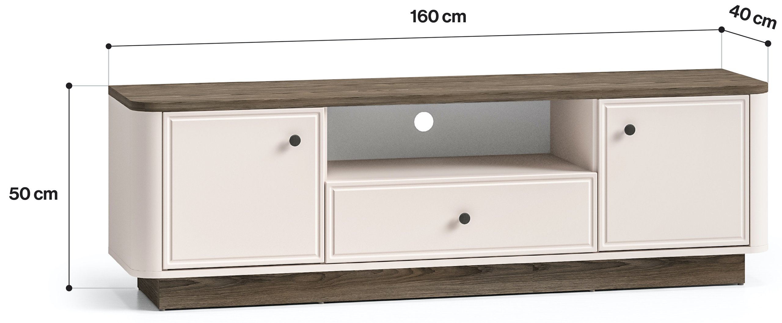 TV komoda Vilavio 05 – ML Meble savršen je izbor za one koji cijene kombinaciju estetike, uporabnosti i kvalitete. Njezin profinjen kontrast boja, metalni detalji u brušenom bakru te zaobljeni rubovi stvaraju dojam potpune elegancije. S dimenzijama 160 × 40 × 50 cm i promišljenim unutarnjim rasporedom nudi dovoljno prostora za sve što vam je potrebno u dnevnom boravku ili spavaćoj sobi. Poljska izrada i kvalitetni materijali jamče da će ova komoda još dugo ostati funkcionalan i estetski privlačan dio vašeg doma.