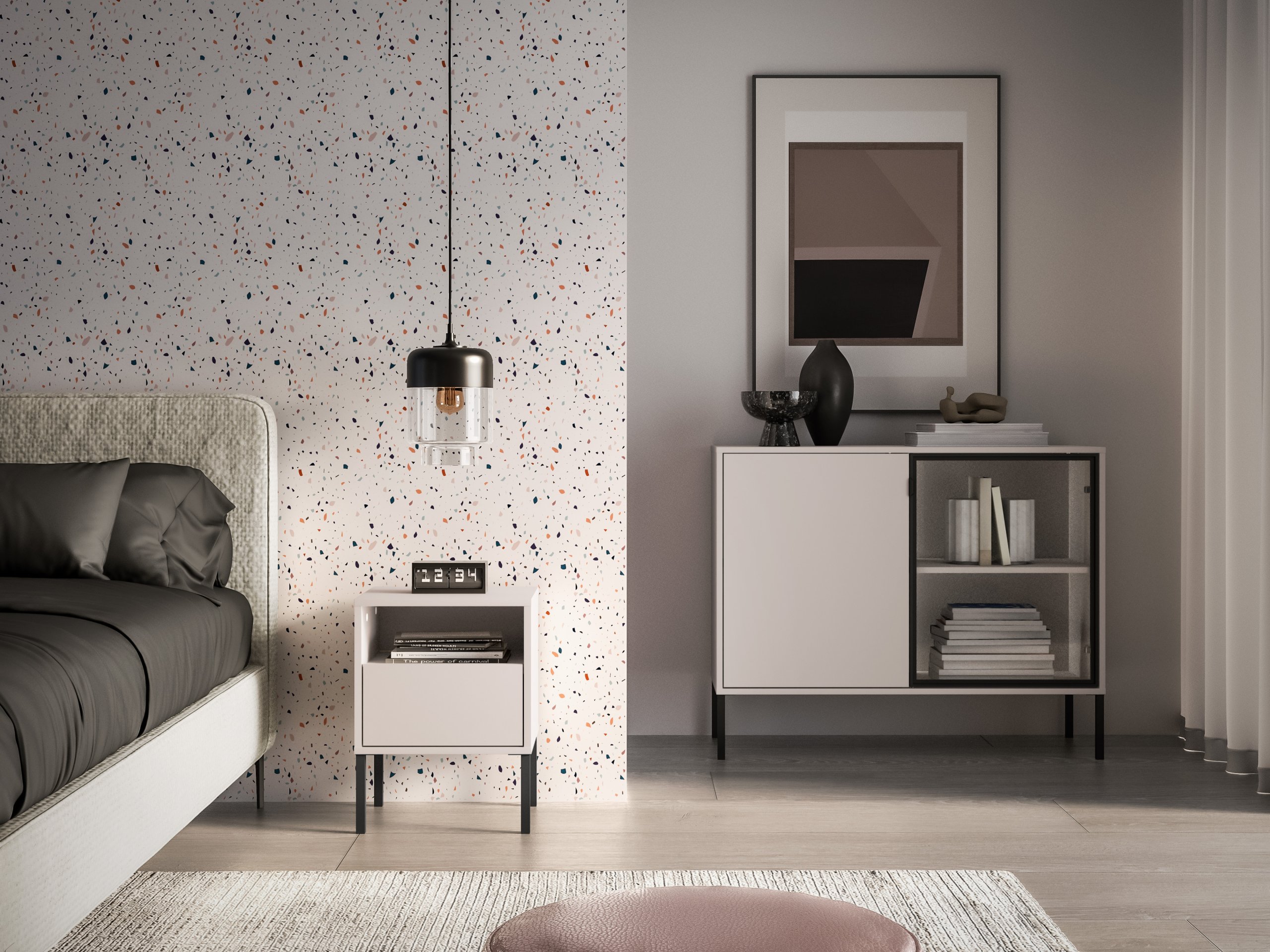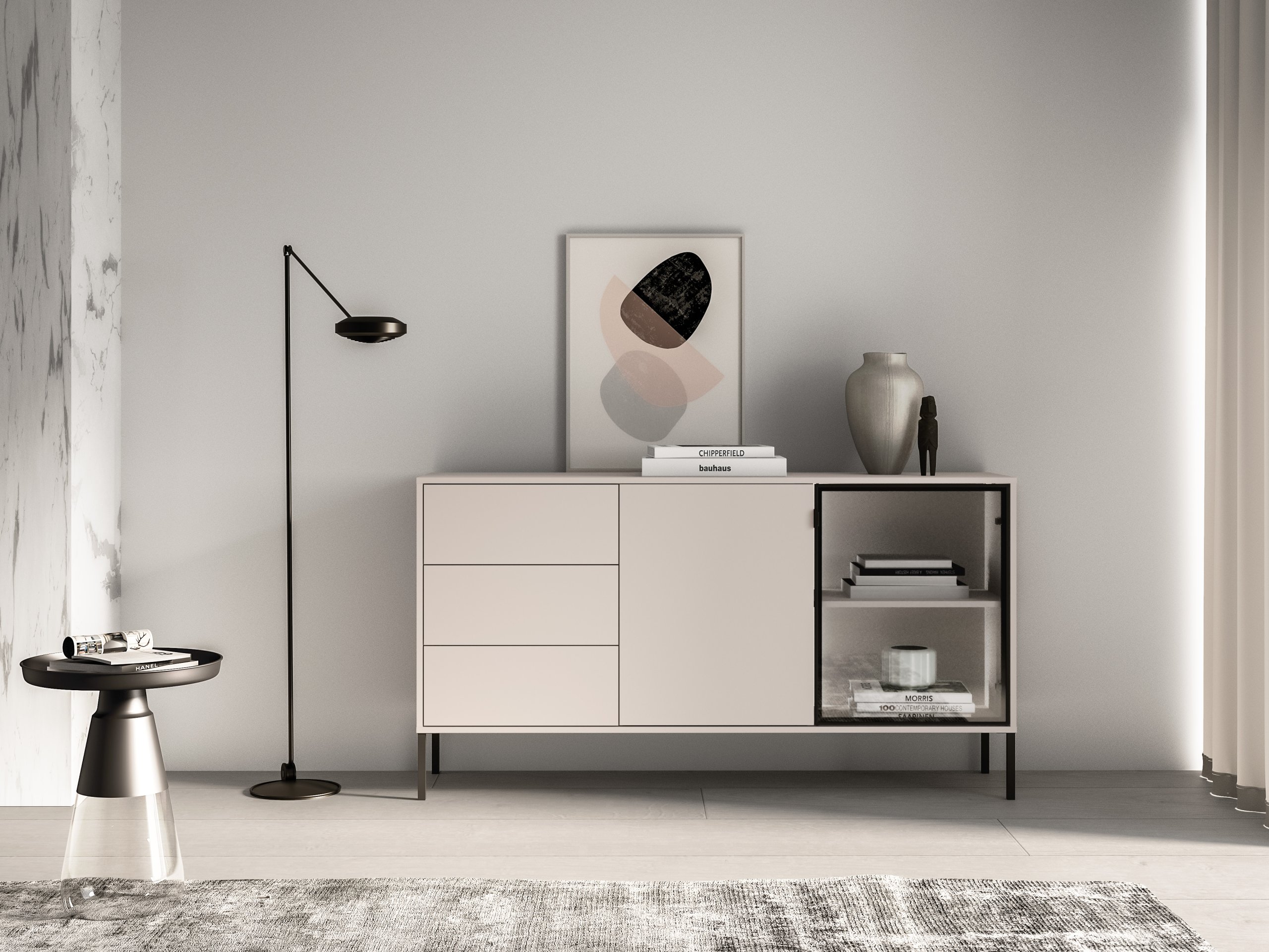 Linija Barnee osmišljena je s mišlju na suvremeni životni prostor, gdje se ljepota i uporabnost nadopunjuju. Boja kašmira, koja prevladava na frontama, gornjem i donjem vjencu, policama, ladicama te stražnjoj ploči, stvara osjećaj topline i udobnosti. U kombinaciji s grafitnim staklom i metalnim elementima, namještaj djeluje elegantno, ali nenametljivo, pa se odlično uklapa i uz svjetlije i uz tamnije zidove te podne obloge.