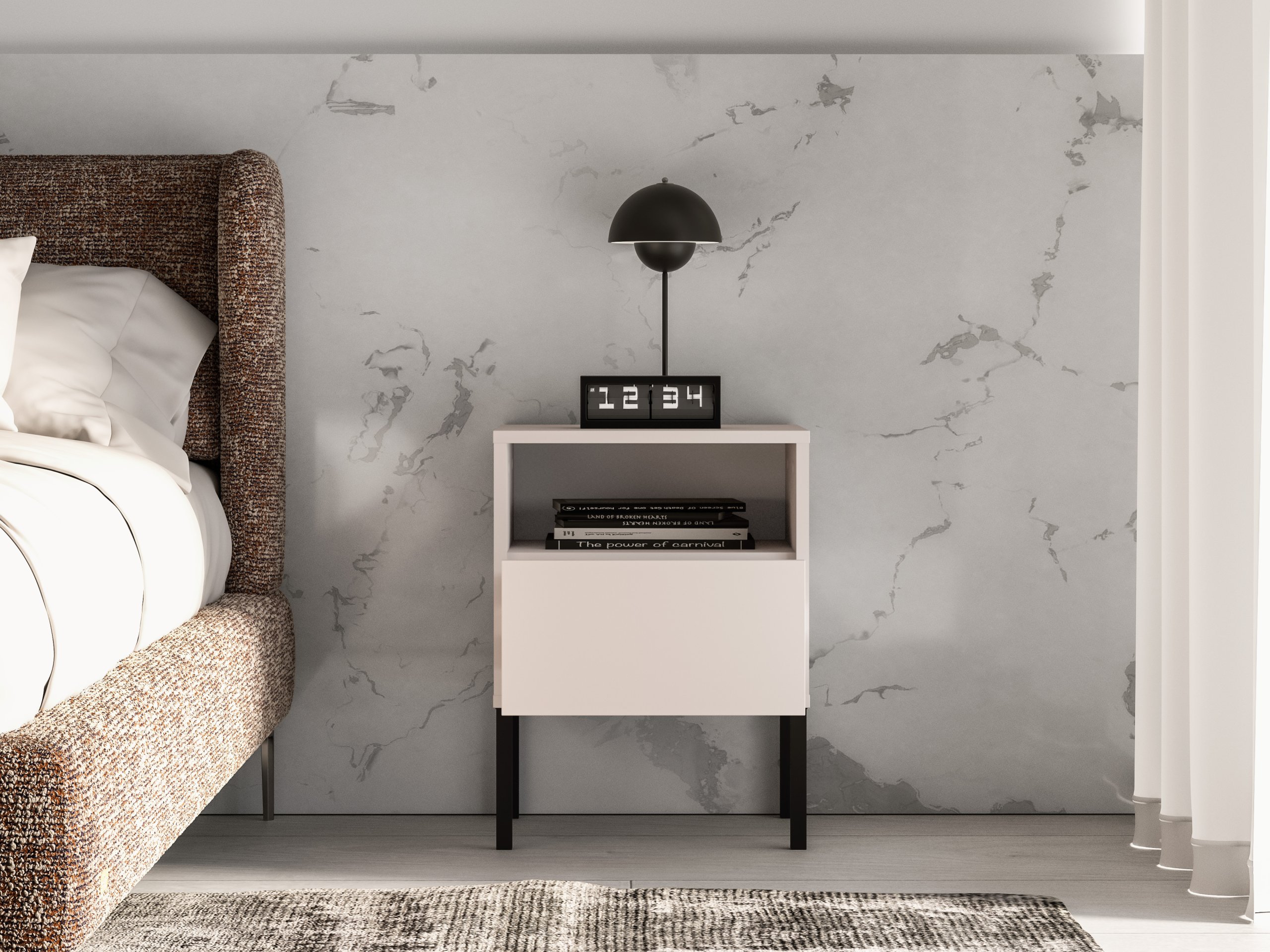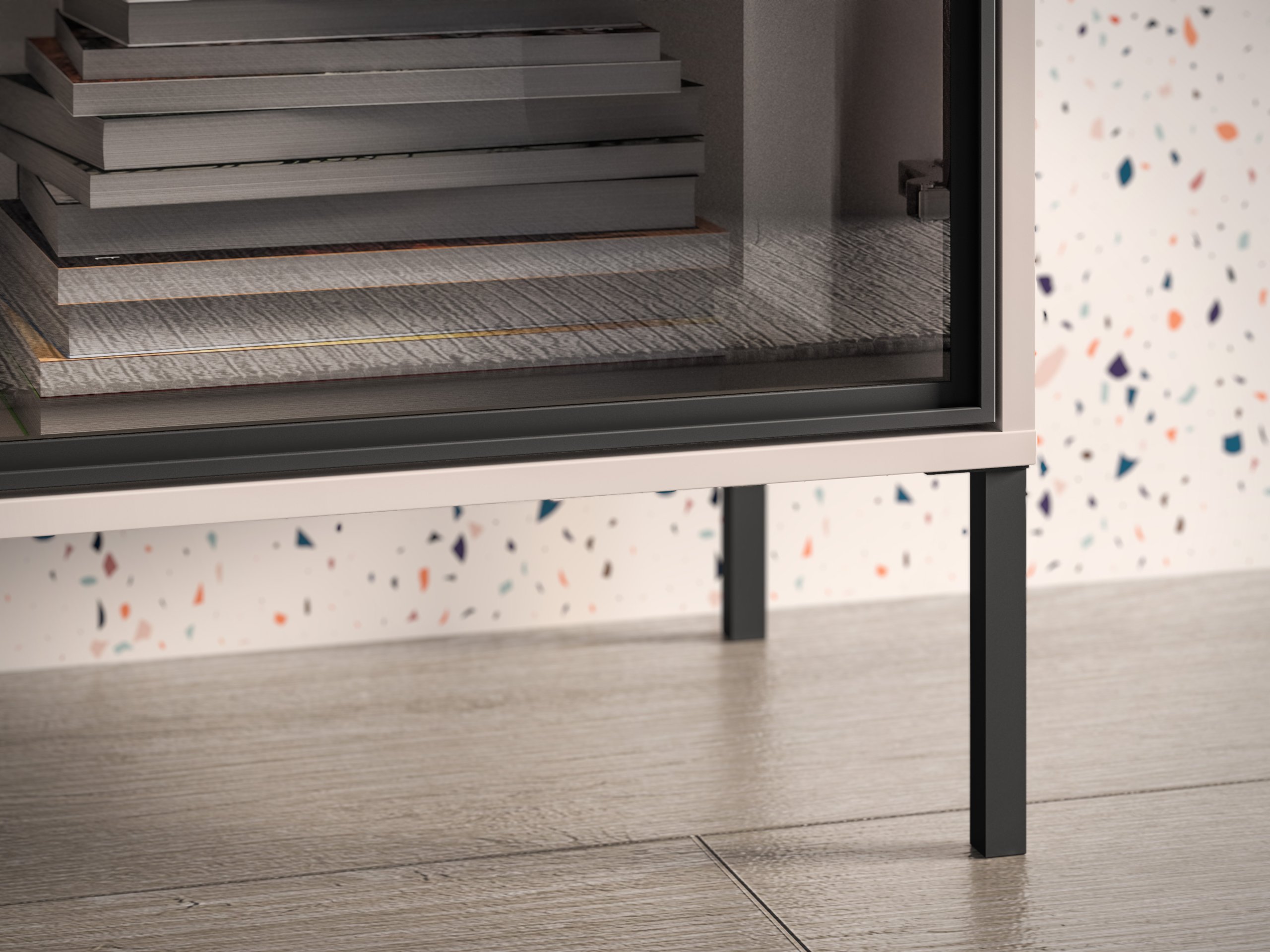 Visoke metalne noge u crnoj boji nisu samo estetski element, već i praktično rješenje – omogućuju lakše čišćenje poda ispod namještaja i povećavaju osjećaj prostranosti u prostoru. Zahvaljujući suvremenim kugličnim vodilicama ladice se otvaraju mekano i tiho, s mogućnošću potpunog izvlačenja za jednostavan pristup sadržaju.