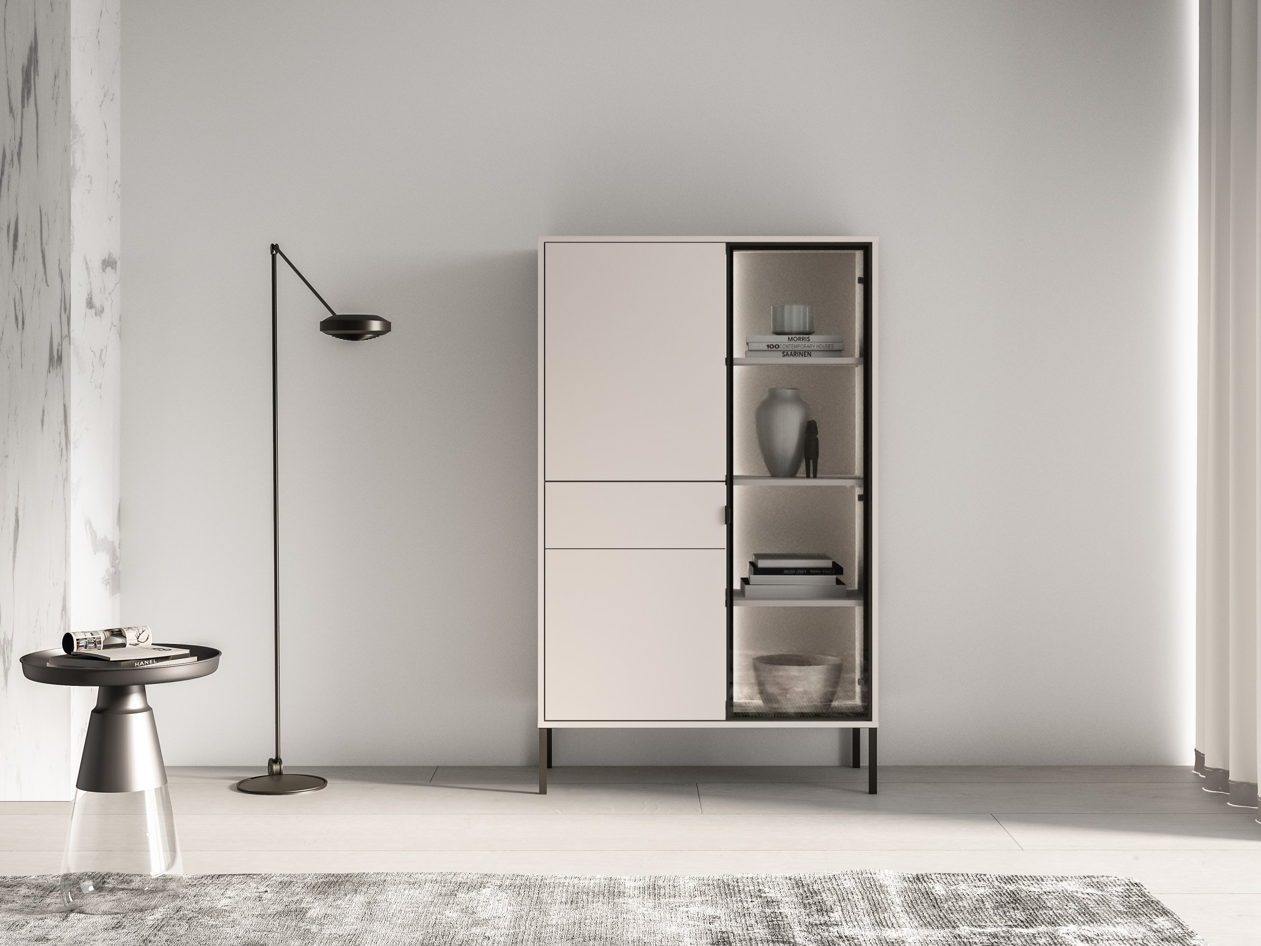 Konstrukcija elemenata iz kolekcije Barnee temelji se na kvalitetnim materijalima koji osiguravaju dug vijek trajanja i stabilnost. Osnovni dijelovi izrađeni su od MDF ploča i iverala, a površine su završene u nježnoj nijansi kašmira. Metalni okvir u crnoj boji daje namještaju moderan, ali istovremeno robustan karakter. Poseban vizualni naglasak predstavljaju kaljena grafitna stakla s aluminijskim okvirom, koja omogućuju elegantan pogled u unutrašnjost vitrina, a pritom zadržavaju diskretnost sadržaja.