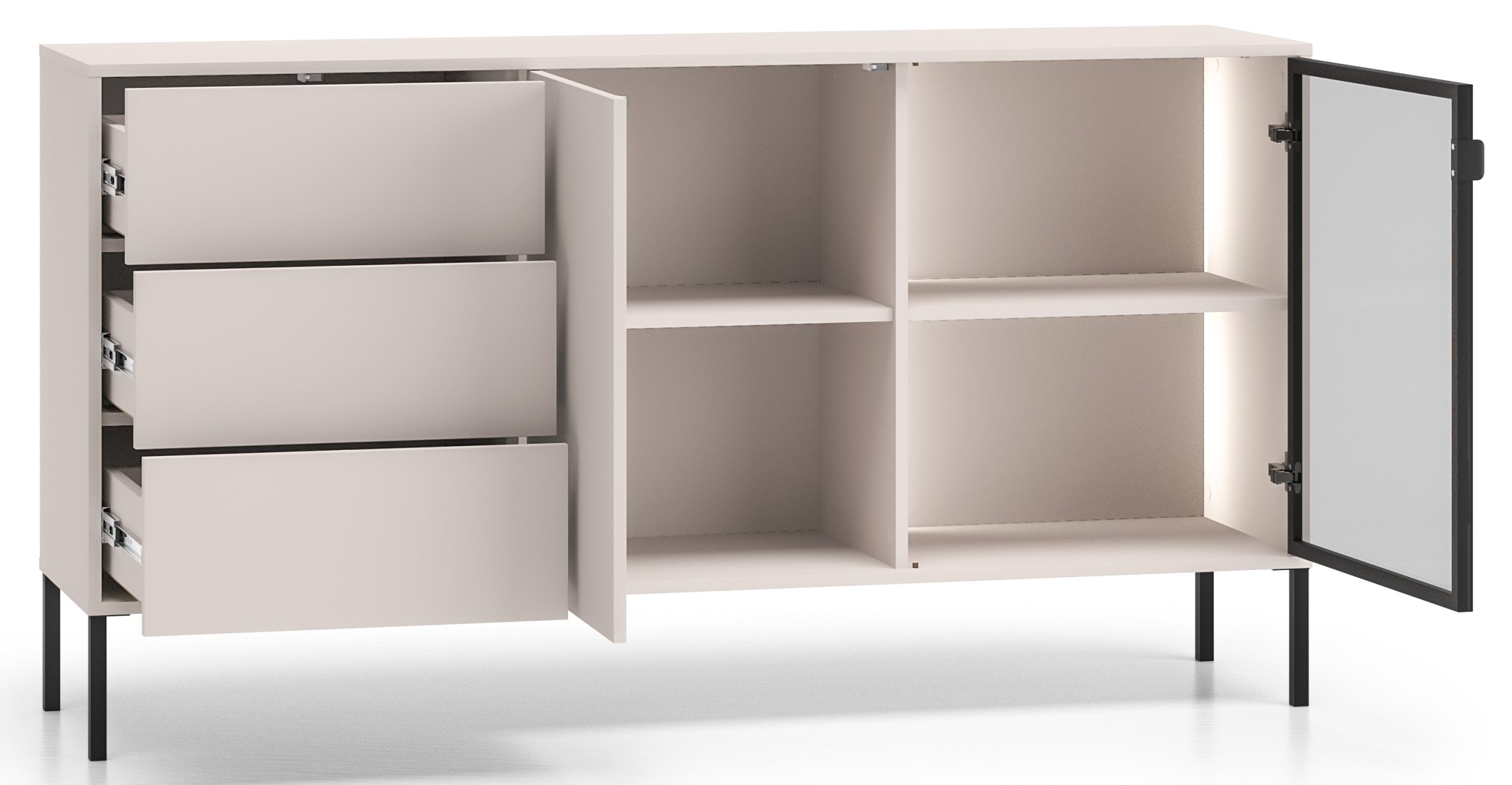 Komoda Barnee 02 – ML Meble idealan je odabir za one koji traže namještaj koji spaja eleganciju, funkcionalnost i kvalitetu. Topla boja kašmira, metalni okvir, grafitno staklo i LED rasvjeta stvaraju profinjen vizualni dojam, a istovremeno komoda nudi praktična rješenja za organizaciju doma. Bez obzira na to postavite li je u dnevni prostor ili spavaću sobu, Barnee 02 će svojim prisustvom unijeti ravnotežu između estetike i uporabnosti – značajku po kojoj je brend ML Meble prepoznatljiv.