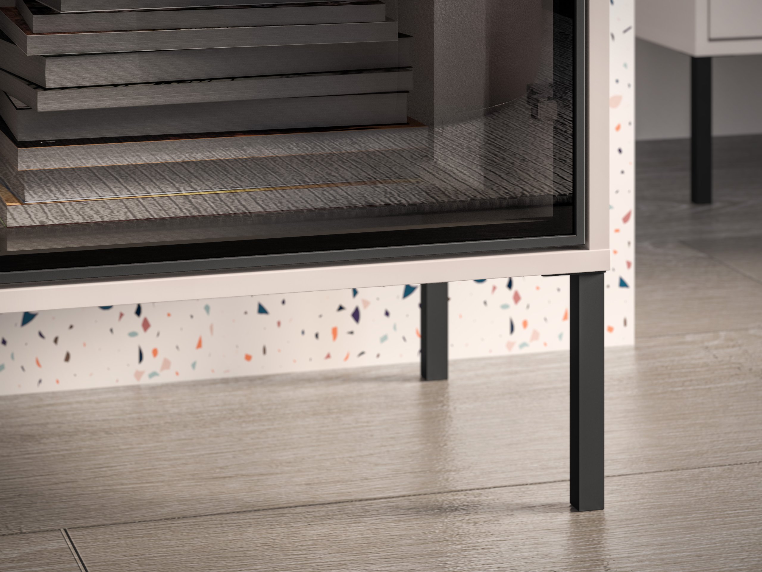 Komoda Barnee 02 nije samo dekorativan komad, već prije svega praktičan element namještaja. Opremljena je s kugličnim vodilicama i sustavom potpunog izvlačenja ladica, koji omogućuje glatko i tiho otvaranje. Time uvijek imate potpun pregled nad sadržajem i jednostavan pristup svim predmetima, bez obzira na njihovu veličinu ili težinu. Visoke metalne noge komodi dodaju prozračnost te olakšavaju čišćenje poda ispod nje, što je važna prednost u svakodnevnoj uporabi.