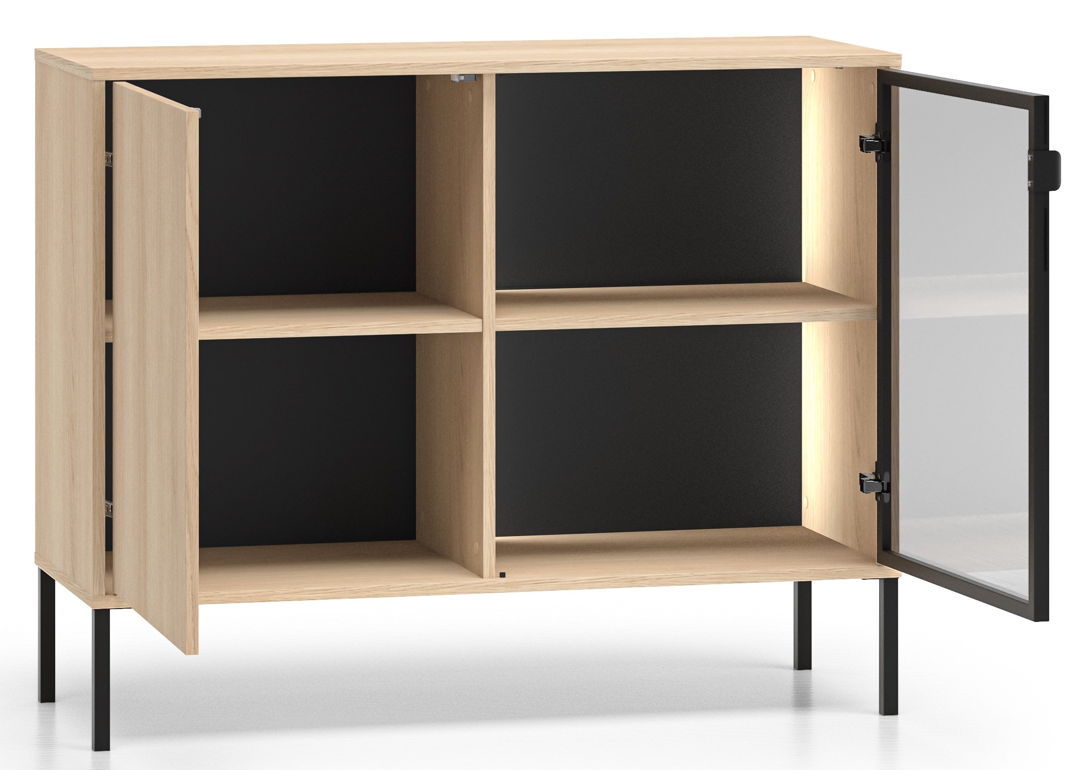 Komoda Barnee 03 donosi savršenu ravnotežu između suvremenog dizajna i industrijske elegancije. Vanjština u boji hrasta lindberg naglašava prirodan izgled drva, dok metalni okvir i visoke noge dodaju dojam robusnosti i lakoće istovremeno. Izrađena je od kvalitetnih materijala – kombinacije MDF ploča, iverala, metalnih elemenata i kaljenog grafitnog stakla, što osigurava čvrstoću, trajnost i vizualnu privlačnost. Unutrašnjost skriva promišljeno osmišljen prostor s više ladica i površina za pohranu, koji omogućuju uredan izgled dnevnog boravka, blagovaonice ili predsoblja.