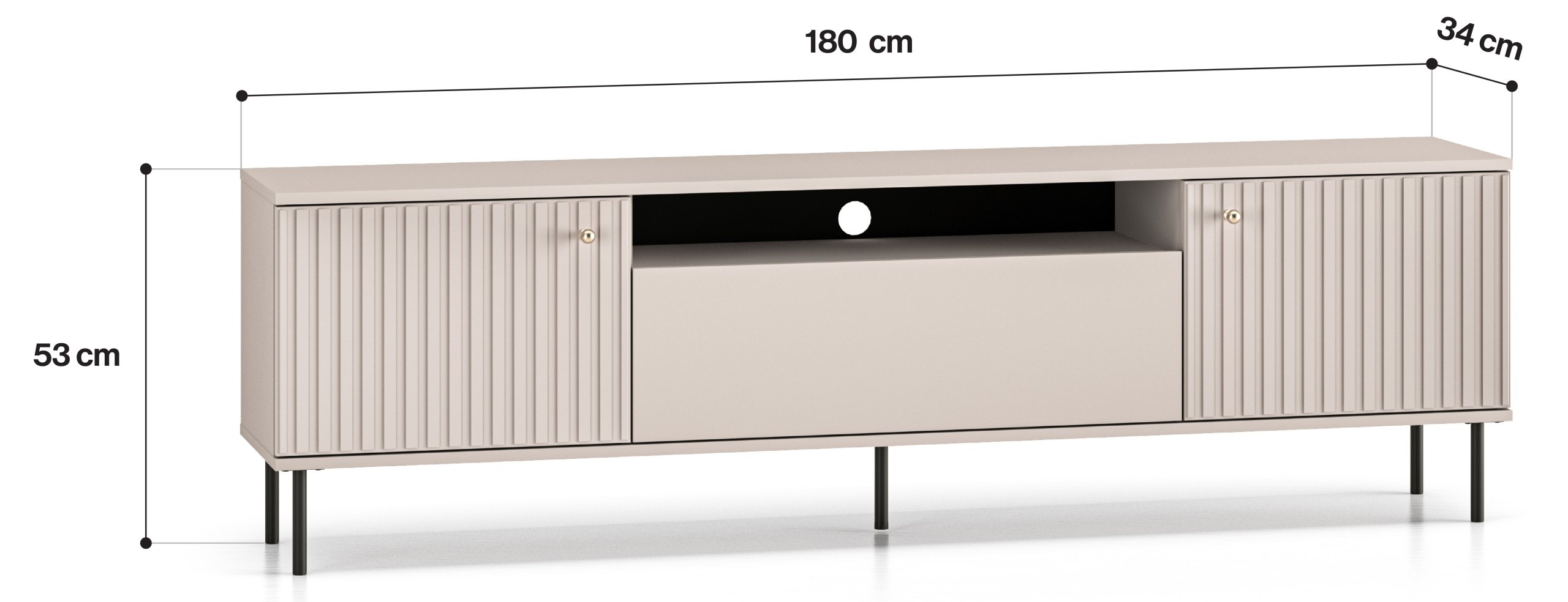 Proizvod mjeri 180x34x53 cm, što omogućuje postavljanje većih televizora te istovremeno nudi prostrane zatvorene i otvorene površine za pohranu. Niska i izdužena silueta komode stvara osjećaj prostranosti i lijepo se nadopunjuje s različitim vrstama garnitura za sjedenje ili dodatnih elemenata u dnevnoj sobi. Zbog promišljenih proporcija komoda je prikladna i za veće i za manje prostore, jer ne djeluje masivno, već elegantno uravnoteženo.
