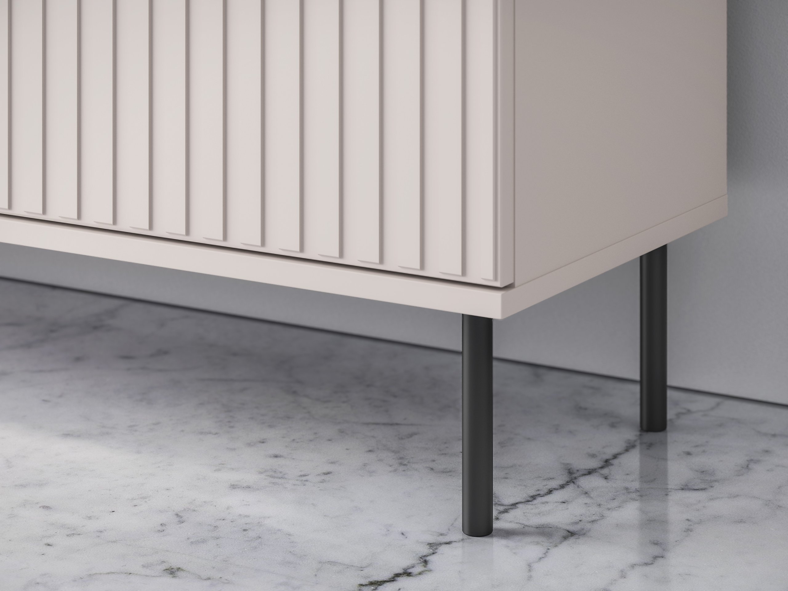 Komodu nadopunjuju crne metalne nogice, koje osiguravaju stabilnost i vizualnu lakoću. Komoda je lagano podignuta od poda, što olakšava čišćenje i omogućuje da prostor djeluje prozračno. Zlatne metalne ručke na vratima predstavljaju elegantan detalj koji se lijepo slaže s nijansom kašmir i dodaje dašak prestiža. Takva kombinacija boja i materijala karakteristična je za suvremene trendove unutarnjeg uređenja, gdje se funkcionalnost povezuje s dekorativnom vrijednošću.