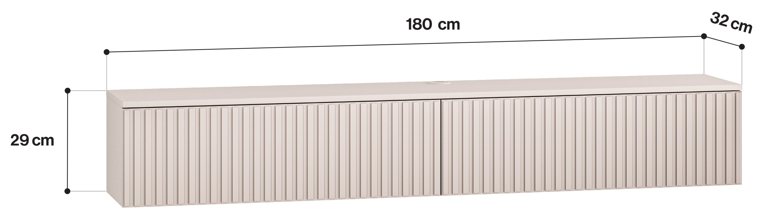 Zidna montaža komode ne omogućuje samo suvremeni izgled, već i optimizaciju prostora, jer se ispod nje može smjestiti dodatna oprema ili dekoracija. Zbog kompaktnih dimenzija 180x32x29 cm prikladna je i za prostrane dnevne sobe i za manje stambene prostore, gdje je važna svaka površina.