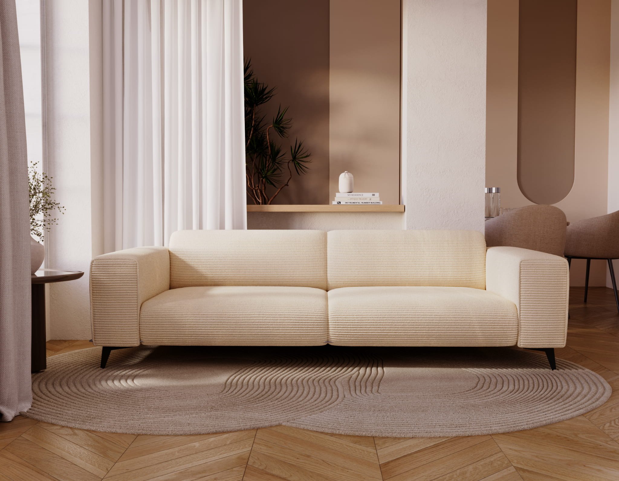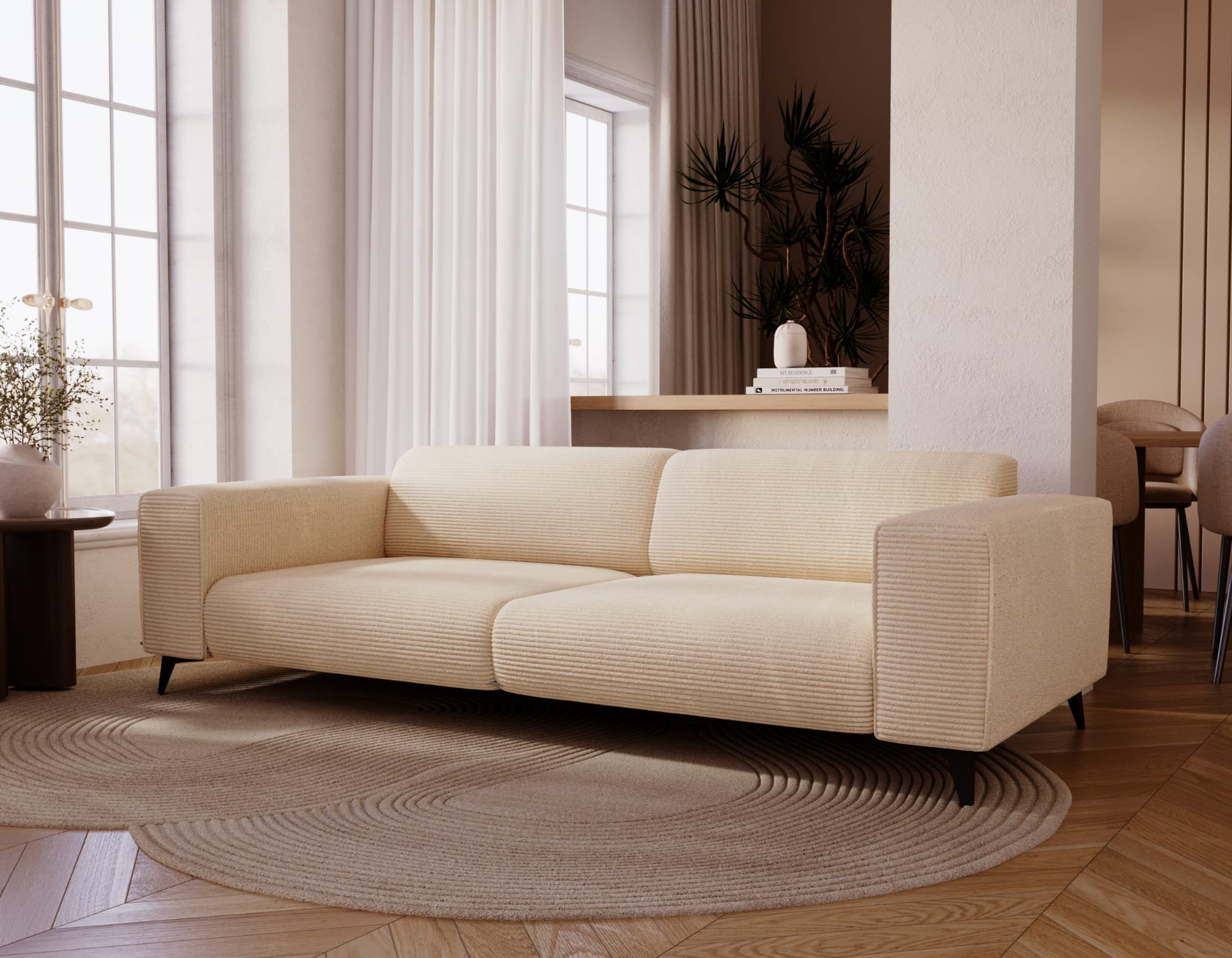 Julia je dizajnirana u modernom stilu koji spaja čiste linije, bezvremensku jednostavnost i funkcionalnost. Glatke površine bez nepotrebnih ukrasa omogućuju da se trosjed lako uklopi u različite estetske koncepte – od svijetlih skandinavskih prostora do industrijski nadahnutih dnevnih soba. Crne metalne noge dodaju vizualnu lakoću i osiguravaju da namještaj ne djeluje masivno, a istovremeno omogućuju lakše čišćenje poda ispod njega. Više noge predstavljaju praktično i estetsko rješenje koje zadržava eleganciju cijelog sastava.