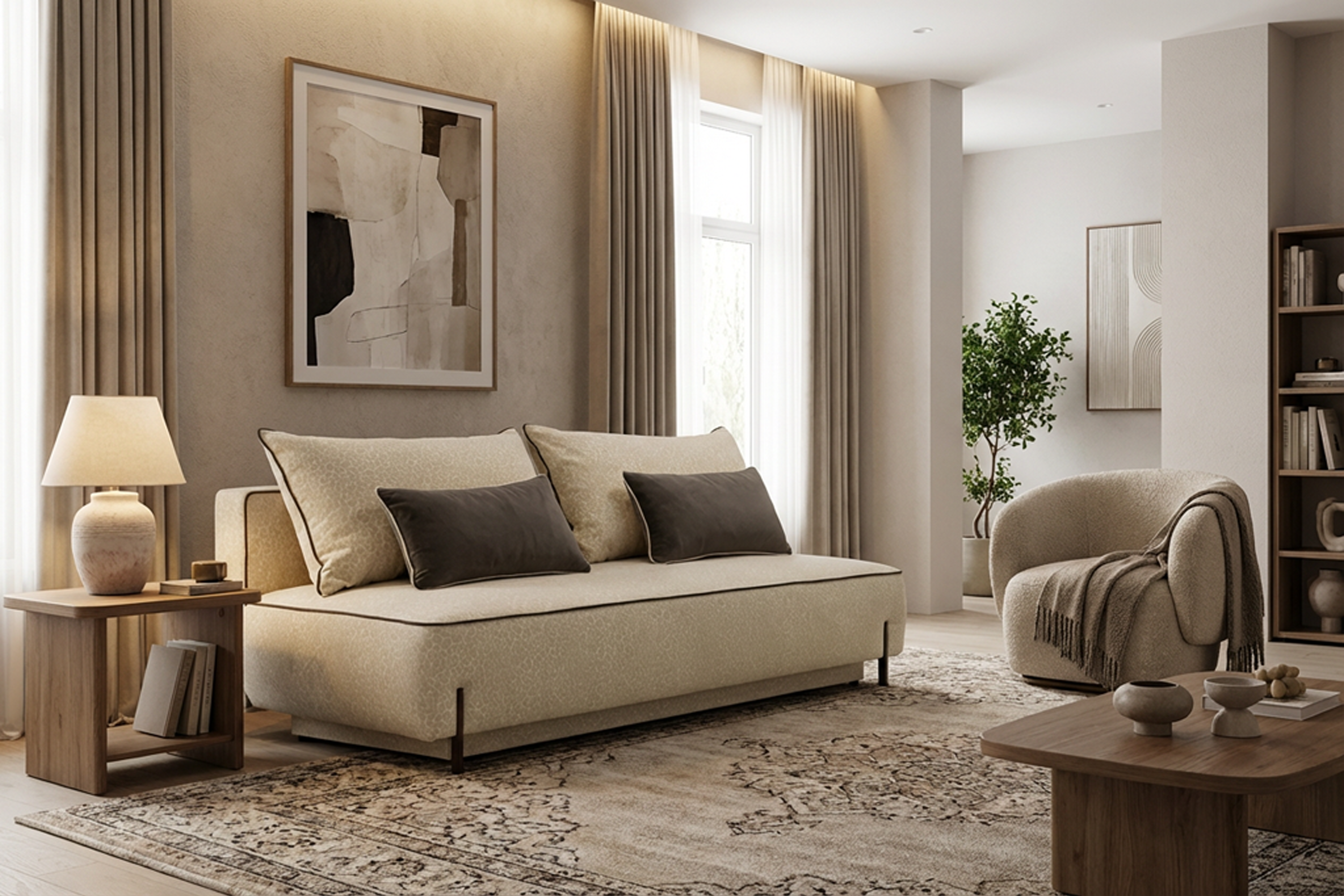 Tkanina korištena za tapeciranje ugodna je na dodir i istodobno otporna na habanje. Zahvaljujući kvalitetnim materijalima, trosjed dugo zadržava svjež izgled i funkcionalnost. Dodatna prednost je jednostavno održavanje – površinu možete očistiti blagim sredstvom za čišćenje tkanina, što je praktično pri svakodnevnoj upotrebi.