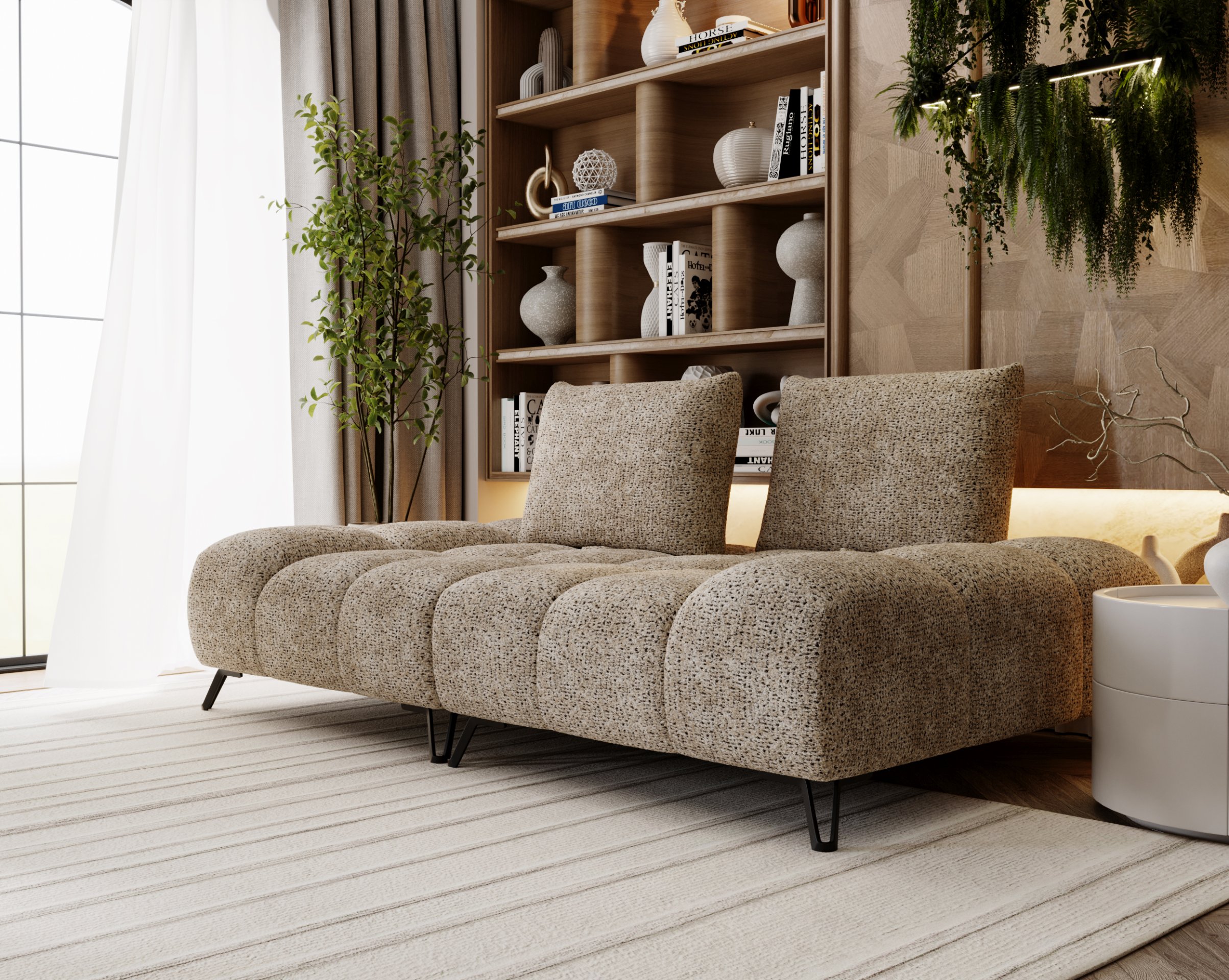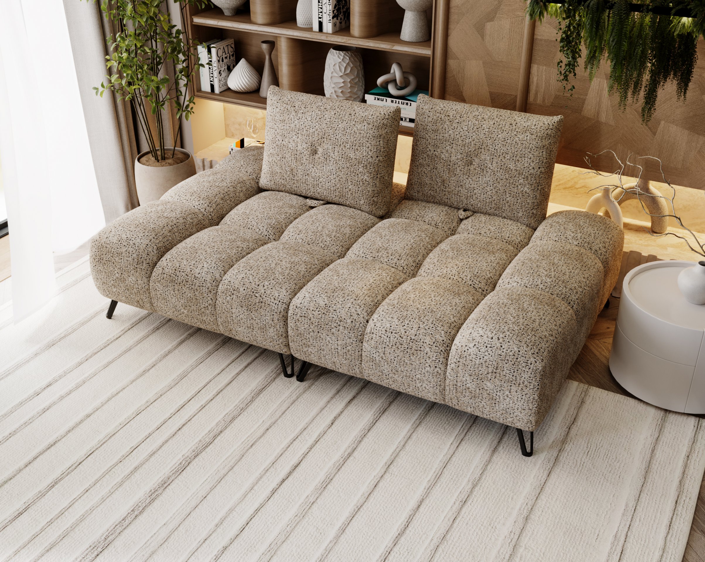 Zahvaljujući kompaktnim, ali prostranim dimenzijama, trosjed se lijepo uklapa u manje i veće dnevne sobe. Zahvaljujući višim nogicama i otvorenom donjem dijelu, prostor djeluje prozračno i svijetlo, što dodatno doprinosi osjećaju prostranosti. Picello je dizajniran kao središnji element prostora koji spaja estetiku i udobnost u jednu cjelinu.