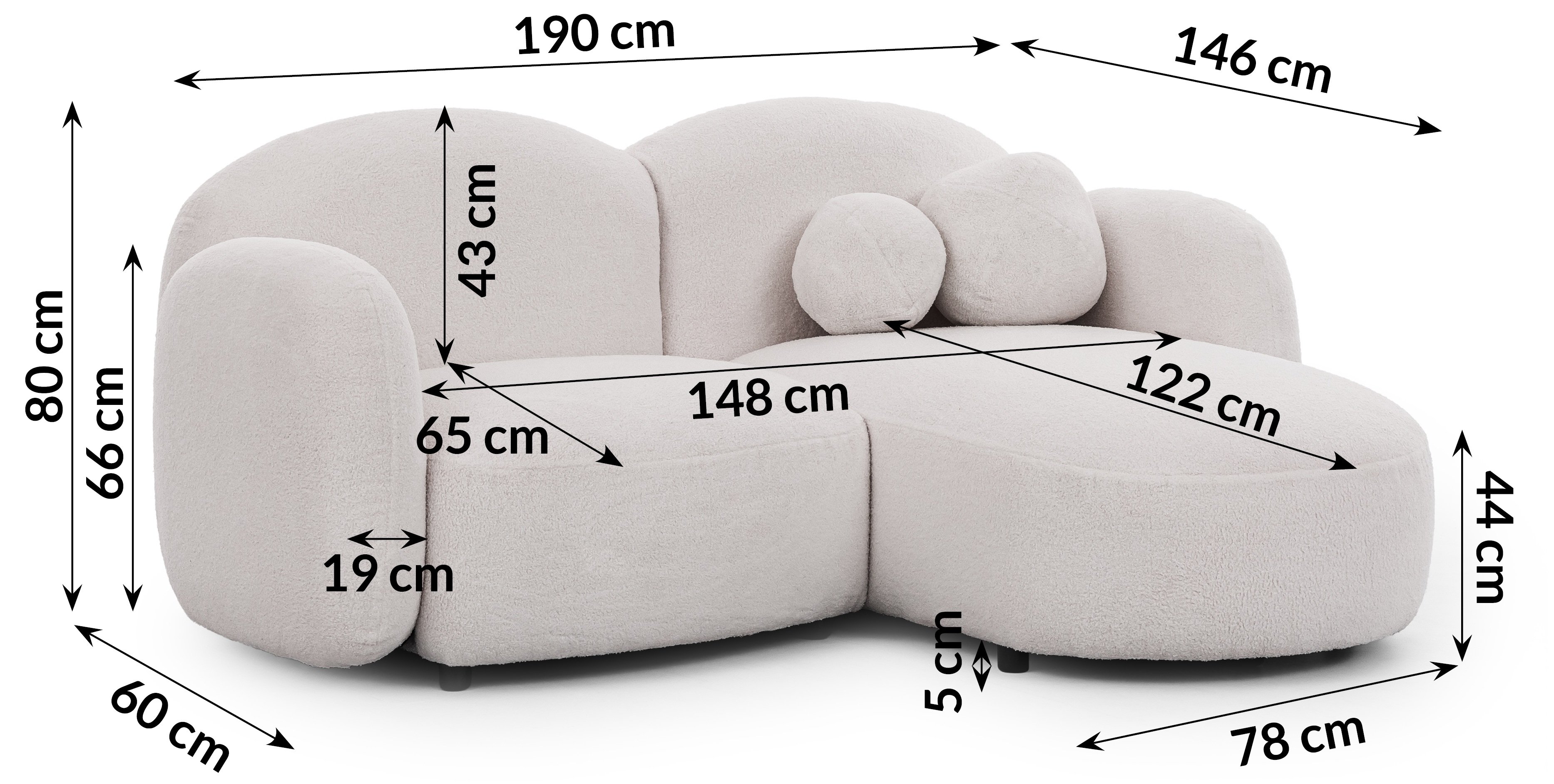 Kutna garnitura opremljena je visoko elastičnom poliuretanskom pjenom i valovitim oprugama koje osiguravaju optimalnu potporu tijelu te udobno sjedenje tijekom cijelog dana. Stražnji dio također je presvučen kvalitetnom tkaninom, pa je garnitura prikladna i za slobodno postavljanje u prostoru. Dodatna prednost je visina sjedala 44 cm, koja omogućuje lako ustajanje i sjedenje, što je posebno važno za starije osobe ili obitelji s djecom.