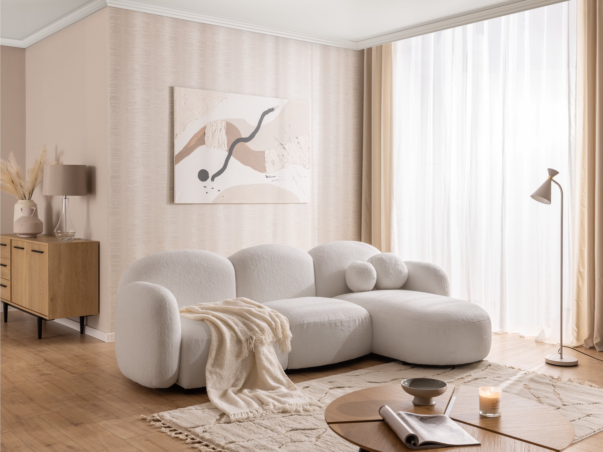 Ova garnitura se odlikuje modernim stilom koji se lako uklapa u različite unutarnje ambijente – od minimalističkih do klasičnijih. Mekane linije i pažljivo oblikovani nasloni za ruke stvaraju dojam prestiža, a istovremeno nude iznimnu udobnost. Budući da je presvučena tkaninom i na stražnjem dijelu, možete je bez brige postaviti u središte prostorije i i dalje će izgledati profinjeno.