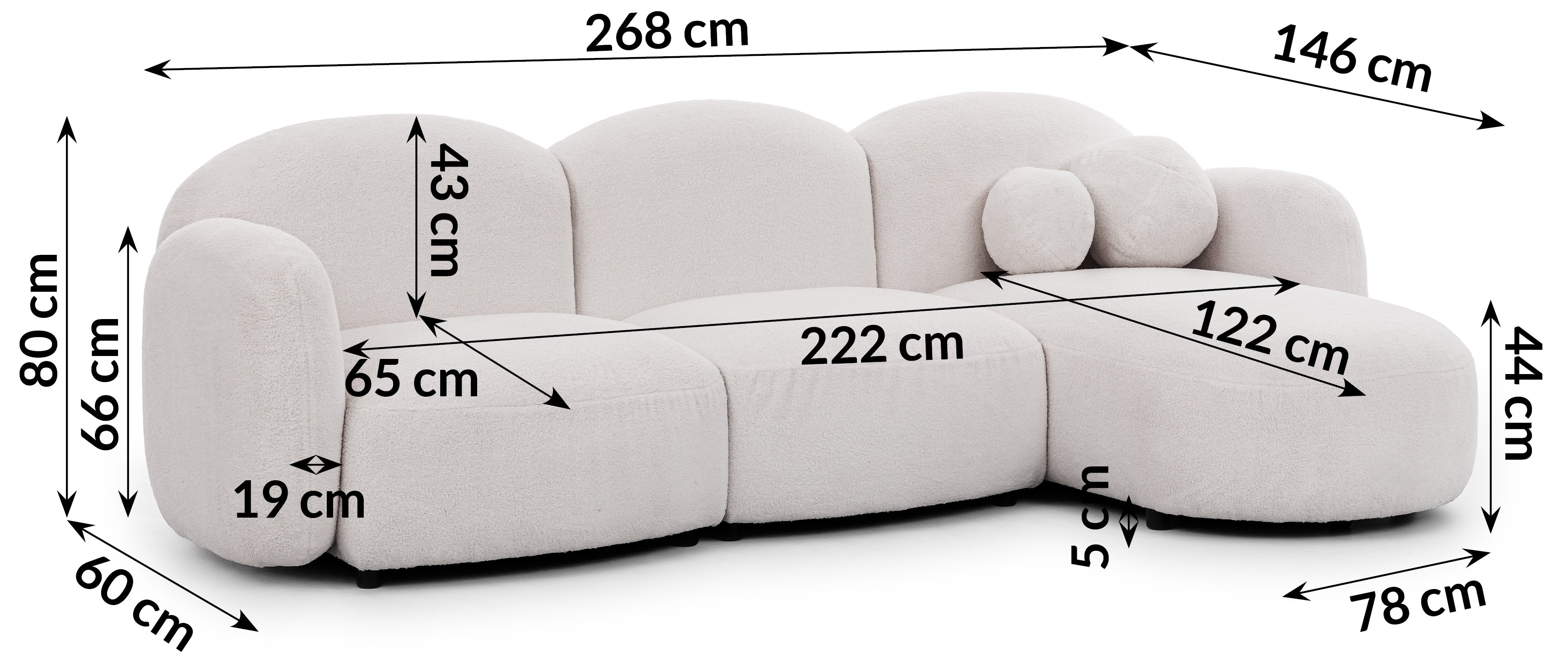 Visina sjedišta iznosi 44 cm, što omogućuje udobno sjedenje. Nasloni su visoki 43 cm i podupiru leđa u prirodnom položaju. Visina naslona za ruke je 66 cm, pa ćete se moći opustiti, dok 65 cm dubine sjedišta bez jastuka pruža ugodno istezanje. Crna plastična nogica visine 5 cm dodaje stabilnost i ujedno omogućuje jednostavno čišćenje poda ispod garniture.