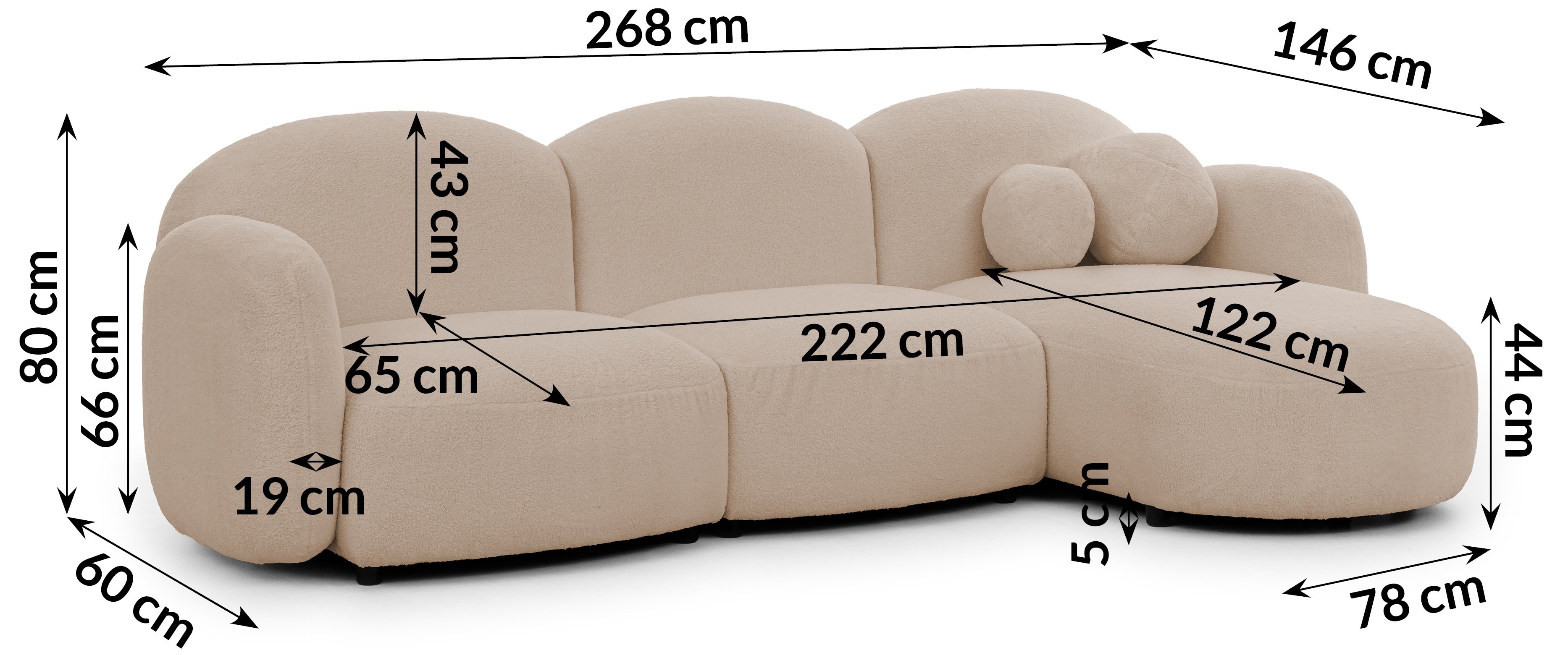 Visina sjedala iznosi 44 cm, što omogućuje udobno sjedenje. Nasloni su visoki 43 cm i podupiru leđa u prirodnom položaju. Visina naslona za ruke je 66 cm, pa ćete se moći opustiti, dok dubina sjedala od 65 cm bez jastuka omogućuje ugodno ispružanje. Crna plastična nogica visine 5 cm dodaje stabilnost i omogućuje jednostavno čišćenje poda ispod garniture.