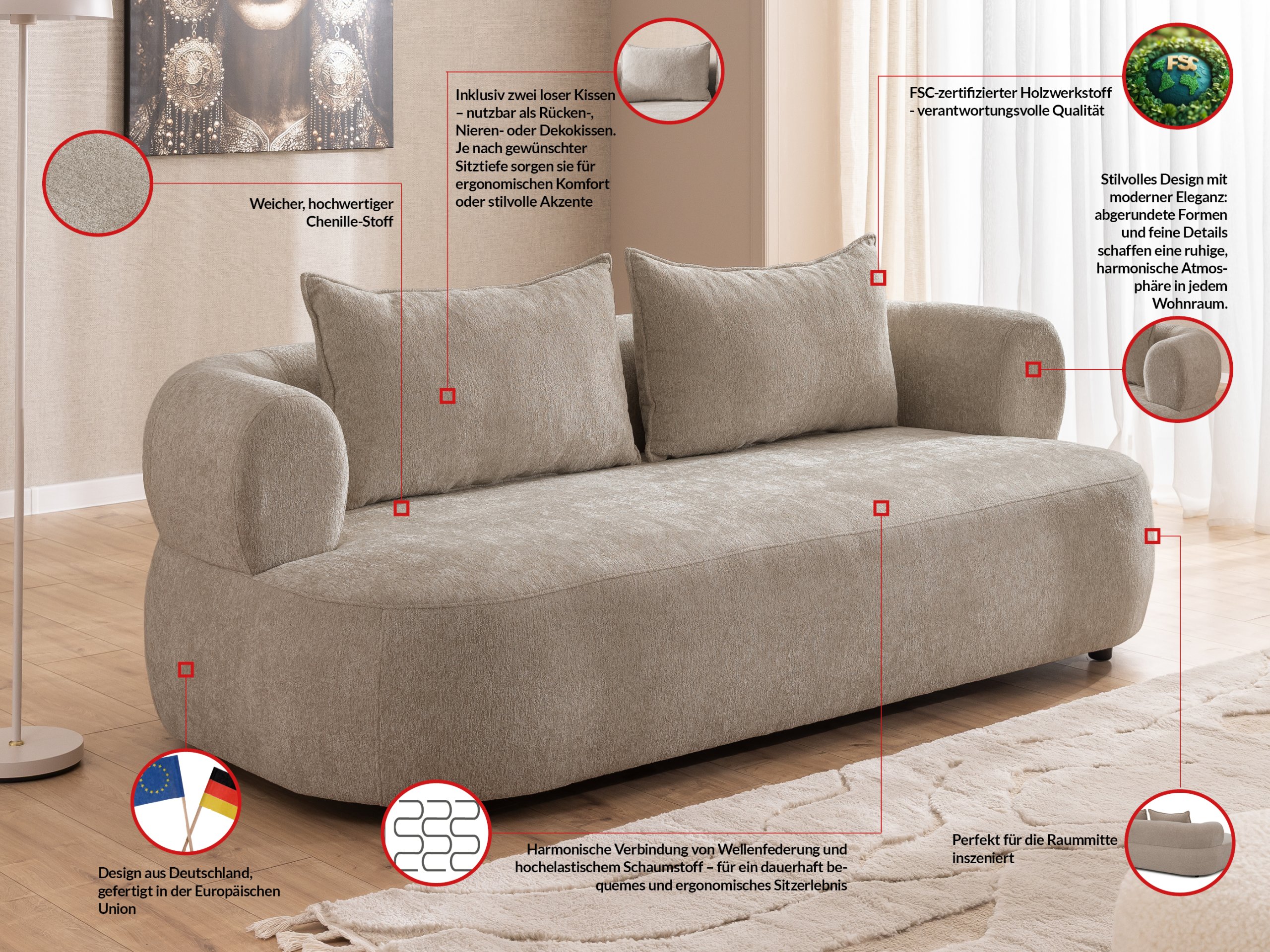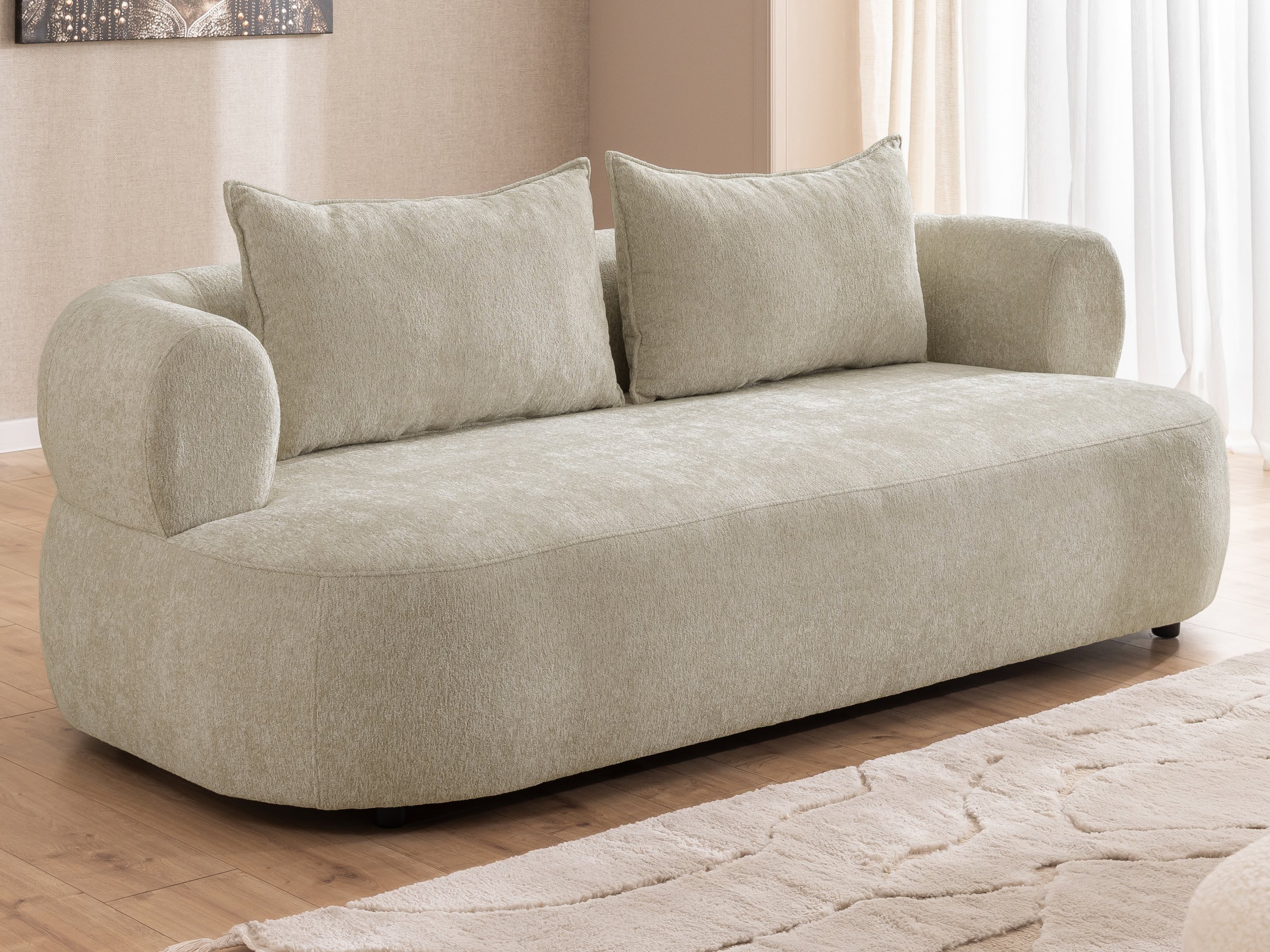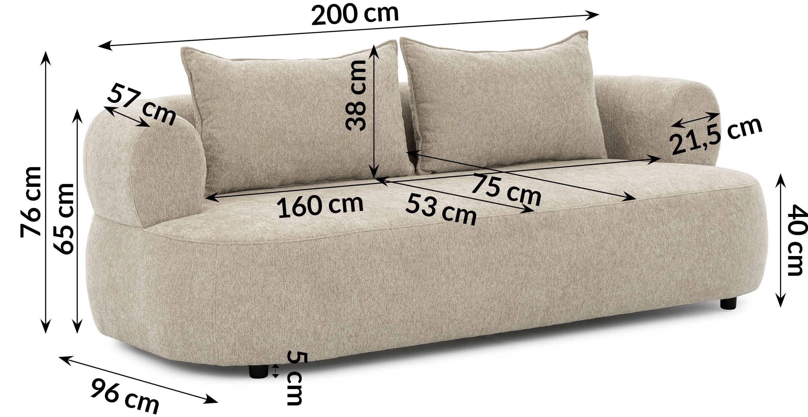 Svojim modernim stilom trosjed se lijepo uklapa u različite dekore – od svijetlih, skandinavskih ambijenata do nešto odvažnijih i živopisnijih interijera. Zahvaljujući širokim naslonima za ruke (21,5 cm) te prostranom sjedalu (160 cm) pruža dovoljno prostora za opuštanje, čitanje knjige ili ugodno druženje uz kavu. Visina sjedala (40 cm) optimalna je za udobno ustajanje i sjedenje, što je posebno važno za starije osobe ili one koji žele veću udobnost.