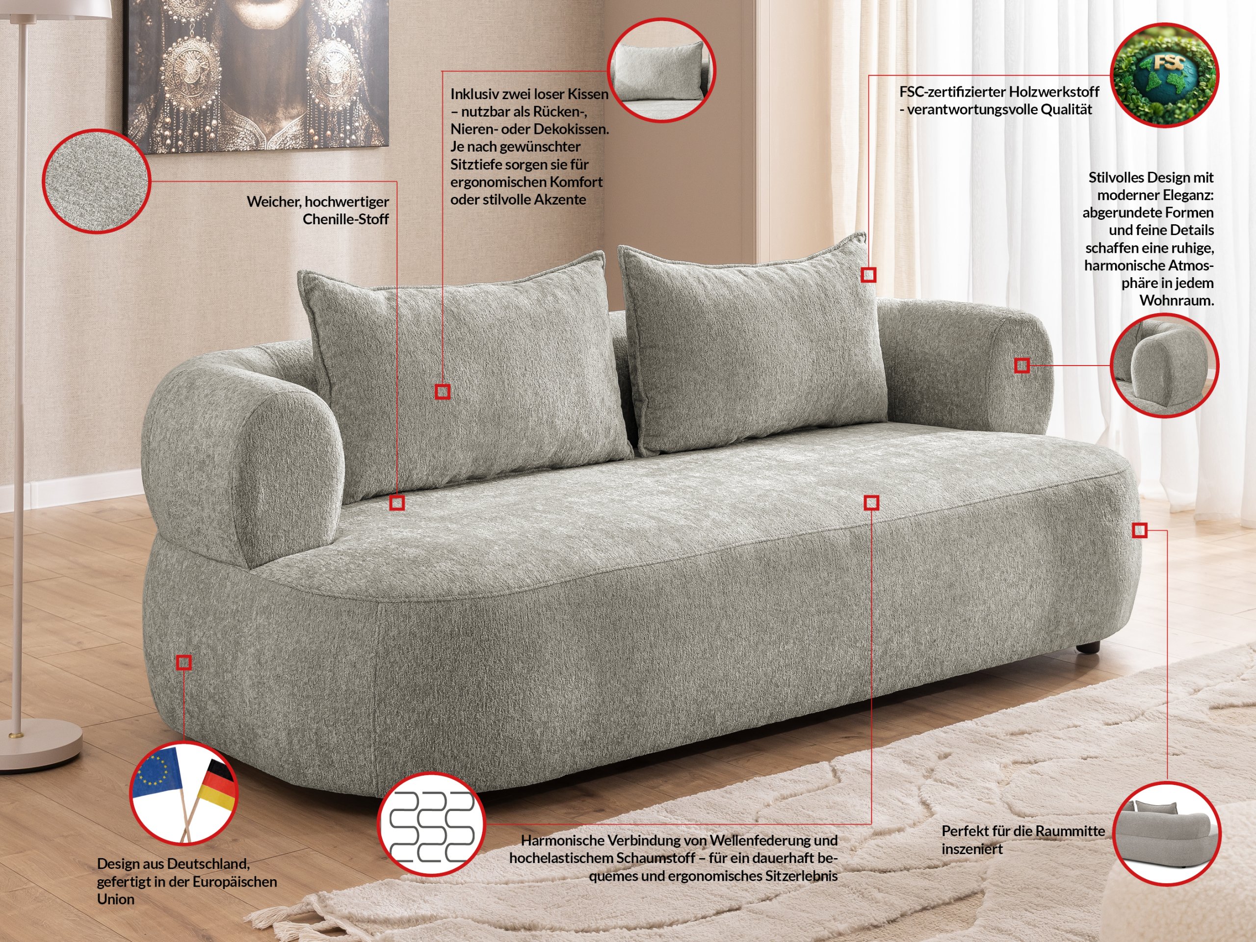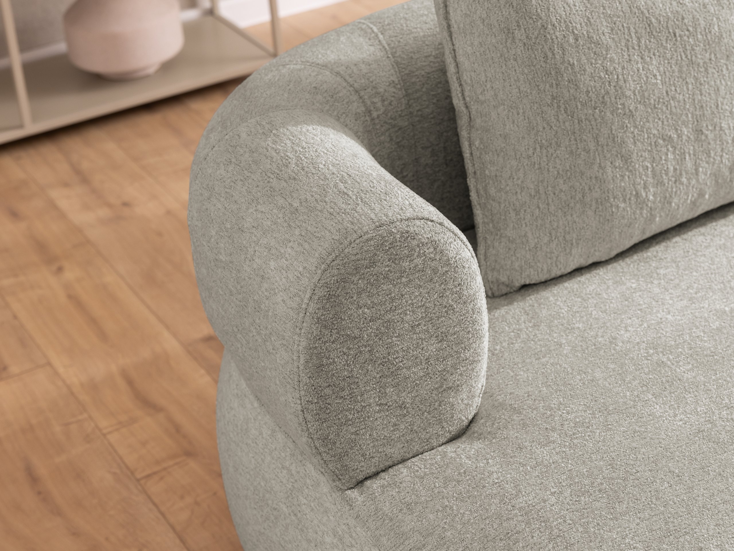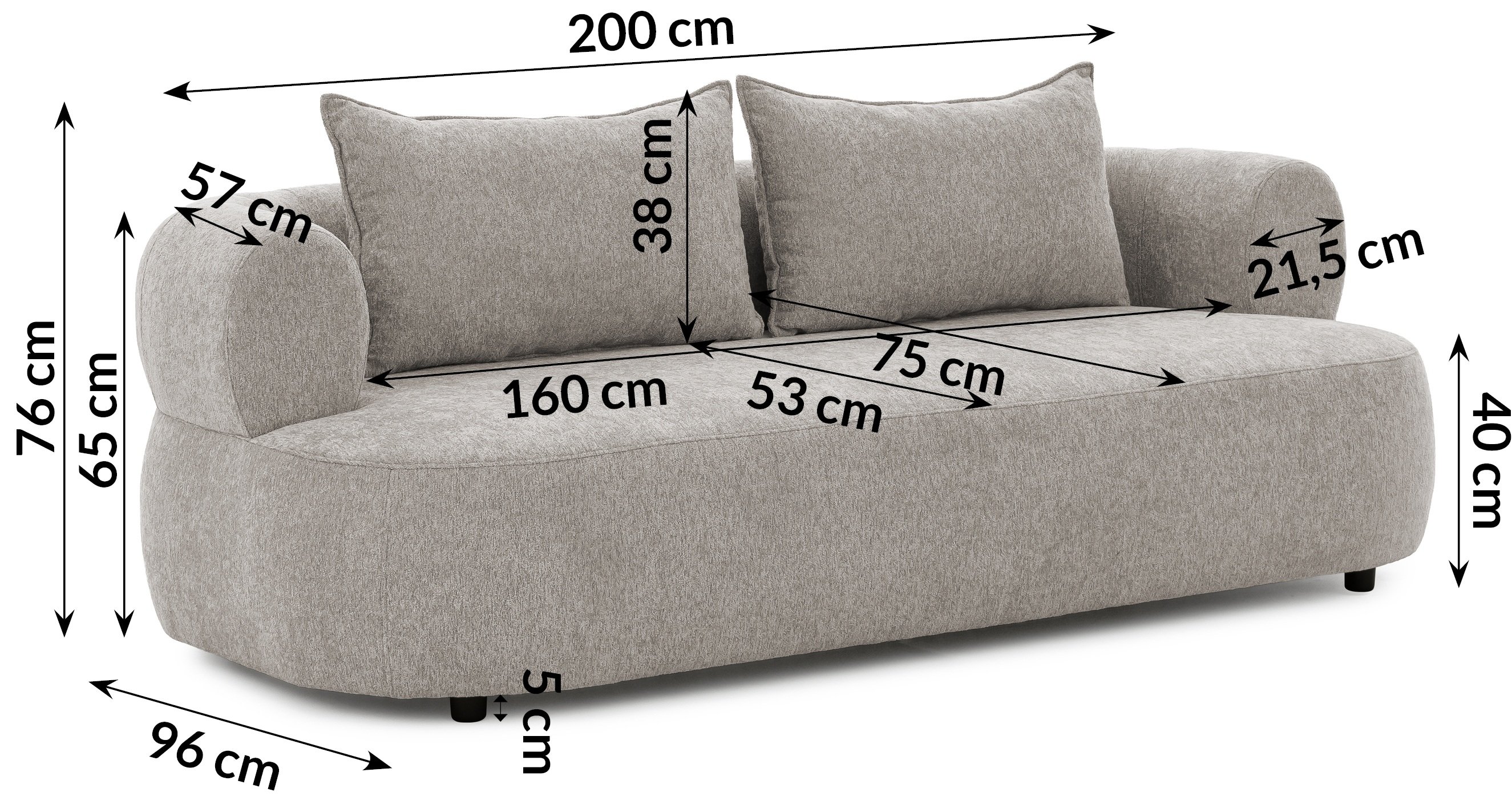 Svojim modernim stilom trosjed se lijepo uklapa u različite dekore – od svijetlih, skandinavskih ambijenata do nešto odvažnijih i šarenijih interijera. Zahvaljujući širokim naslonima za ruke (21,5 cm) te prostranom sjedalu (160 cm) nudi dovoljno prostora za opuštanje, čitanje knjige ili ugodno druženje uz kavu. Visina sjedala (40 cm) optimalna je za udobno ustajanje i sjedenje, što je posebno važno za starije osobe ili one koji žele veću udobnost.