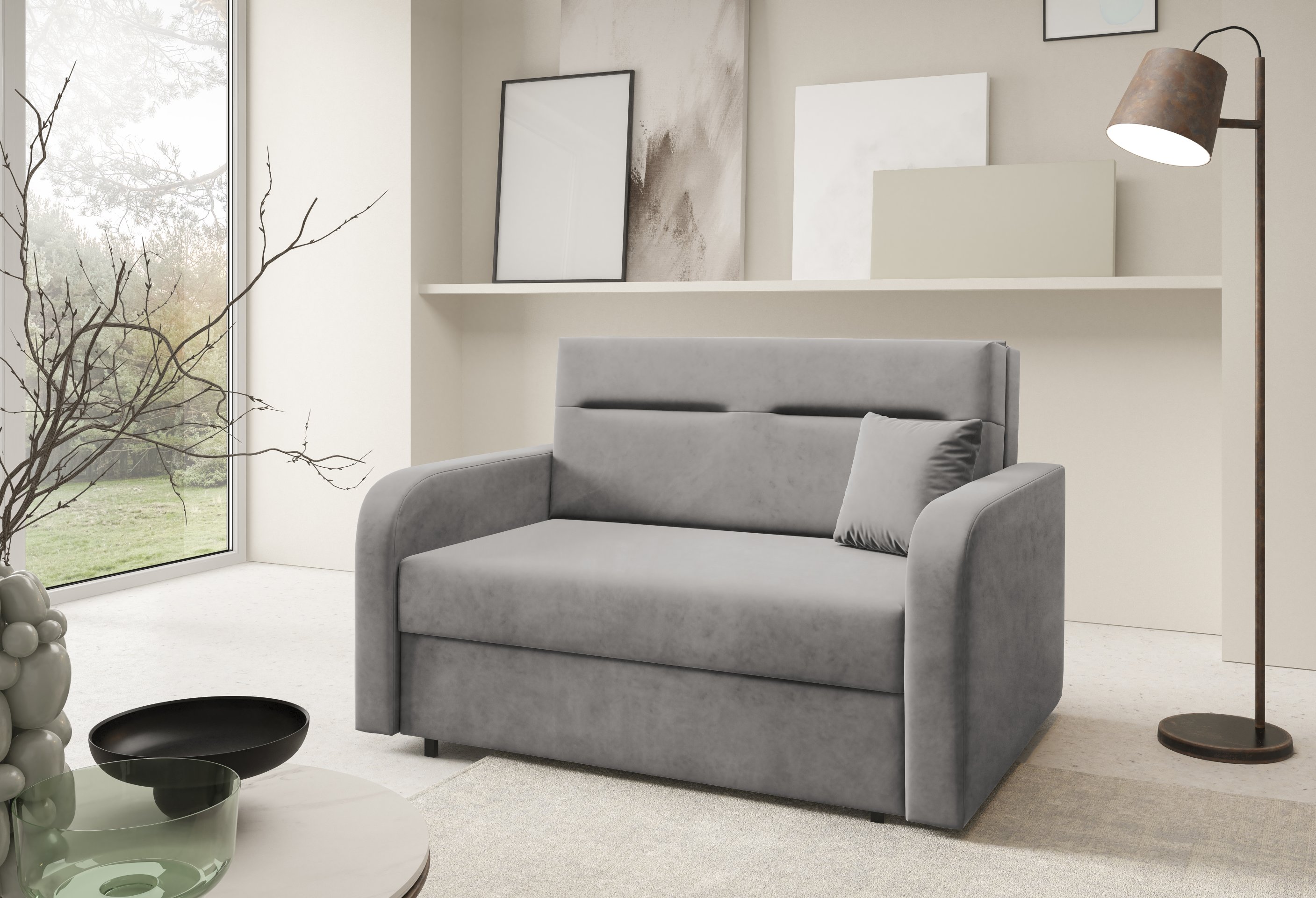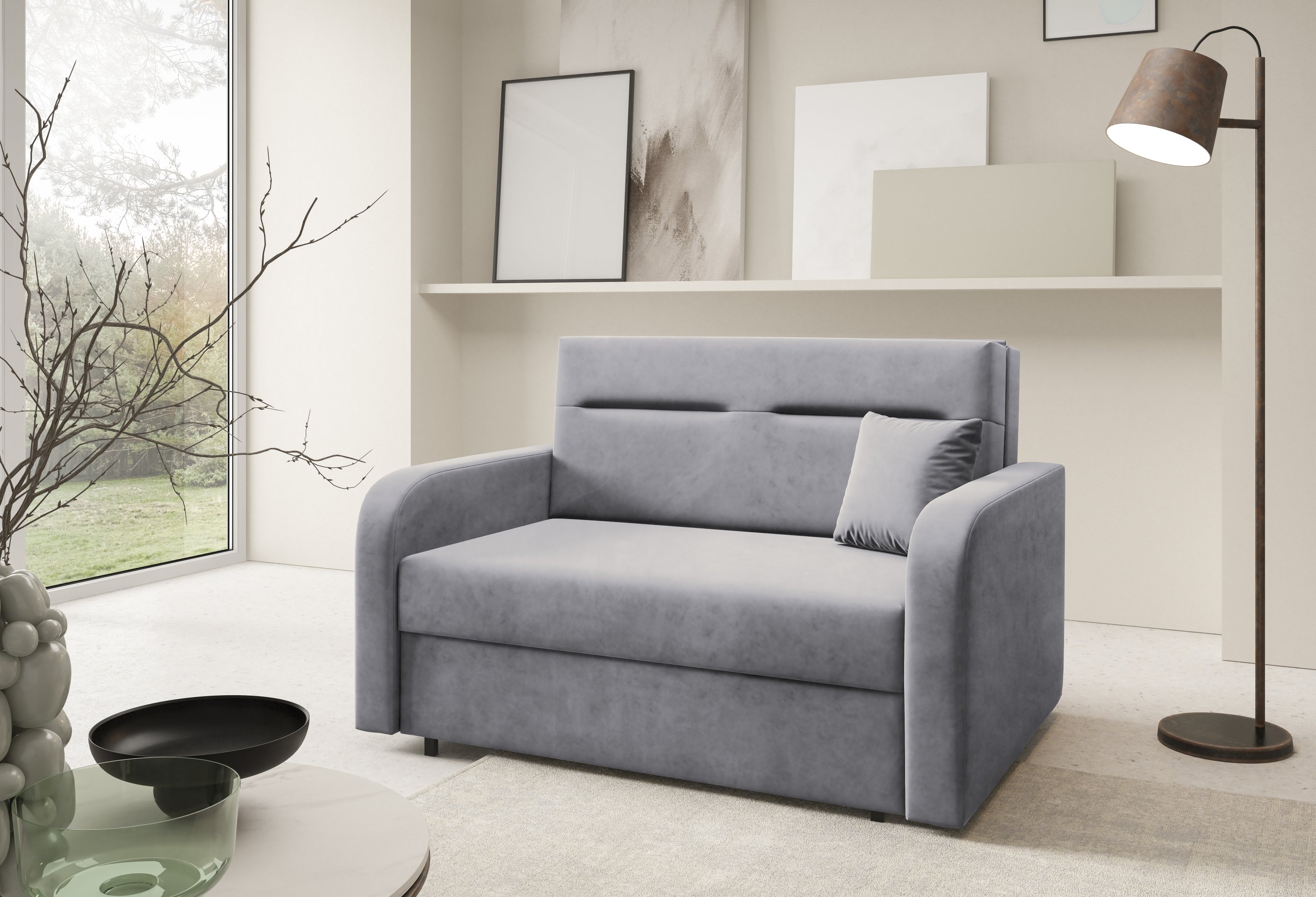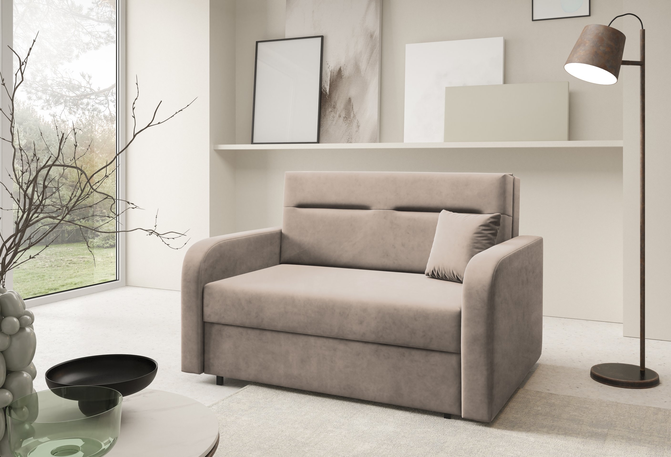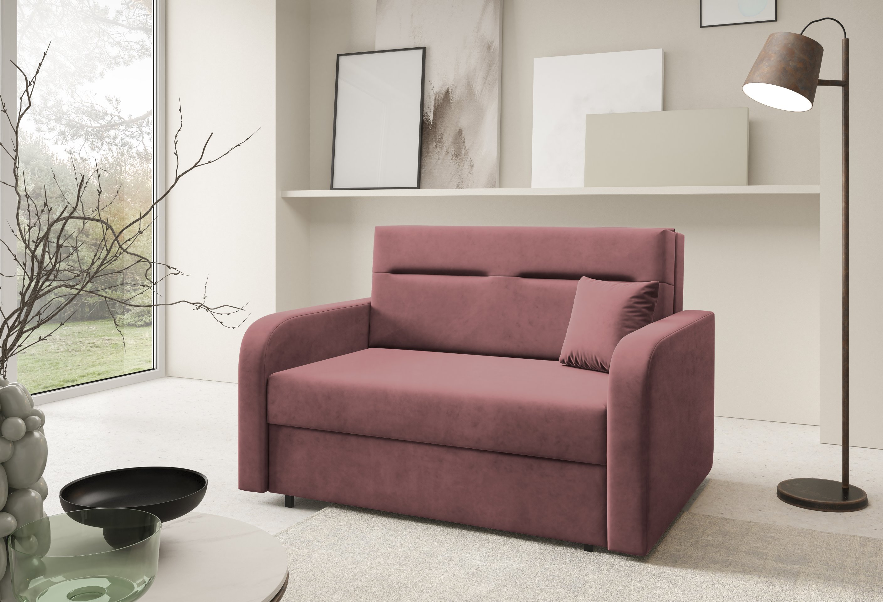 Na fotografiji je dvosjed prikazan u tkanini Kronos 14, koja po izgledu i dodiru podsjeća na baršun te unosi ugodnu toplinu u prostor. Model je dostupan u više varijanti boja, pa ga je moguće lako uskladiti s postojećim interijerom. Zbog svoje kompaktne veličine i neutralnog dizajna lijepo se uklapa i u dječje te omladinske sobe, manje dnevne prostore ili vikendice.