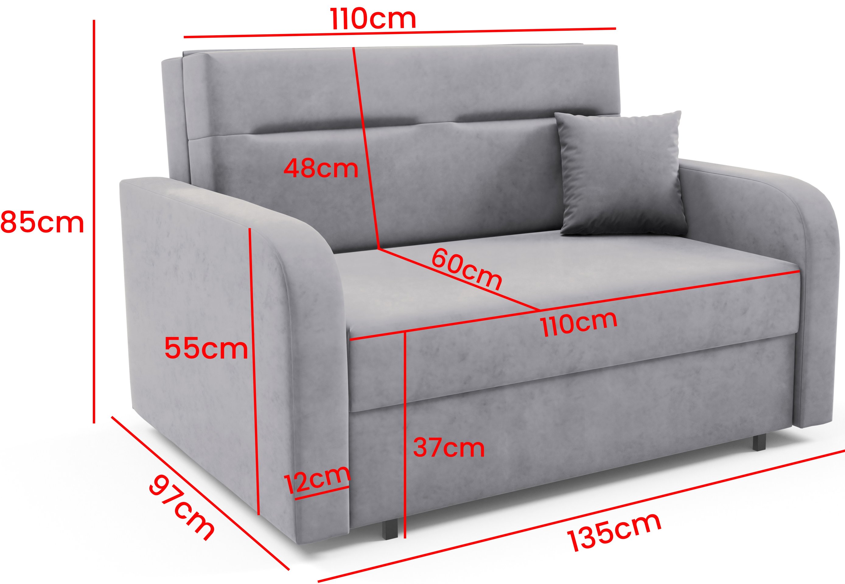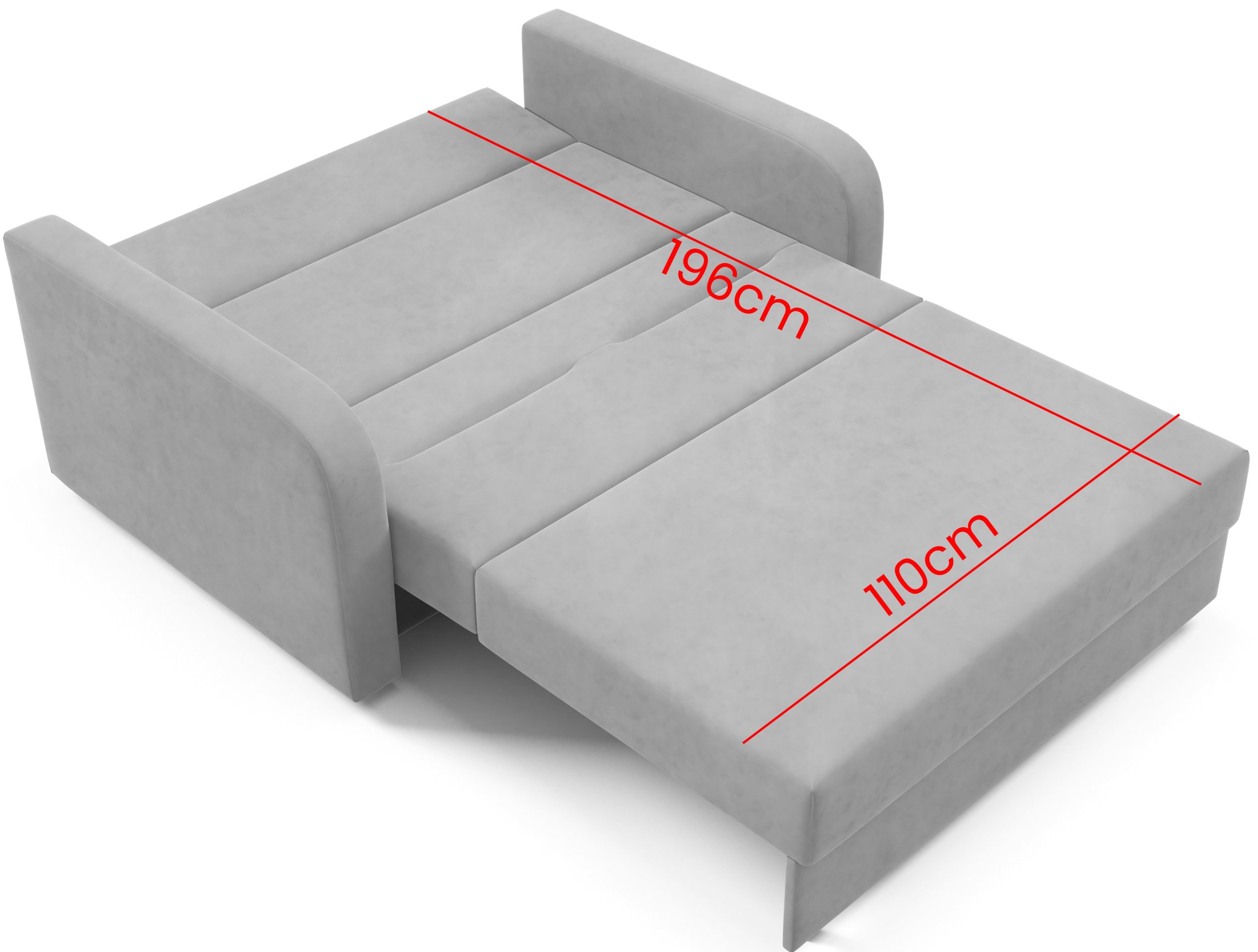 Ležajna površina iznosi 110x196 cm, što osigurava dovoljno prostora za jednu odraslu osobu ili dvoje djece. Dvosjed je dizajniran s mislima na svakodnevnu upotrebu, jer je konstrukcija čvrsta i stabilna. Okvir je izrađen od drveta, što osigurava dugotrajnu izdržljivost, dok je unutrašnjost obložena kvalitetnom pjenom, koja pruža meko, a istovremeno potporno sjedenje. Najveće dopušteno opterećenje iznosi 125 kg, što dodatno potvrđuje pouzdanost proizvoda.