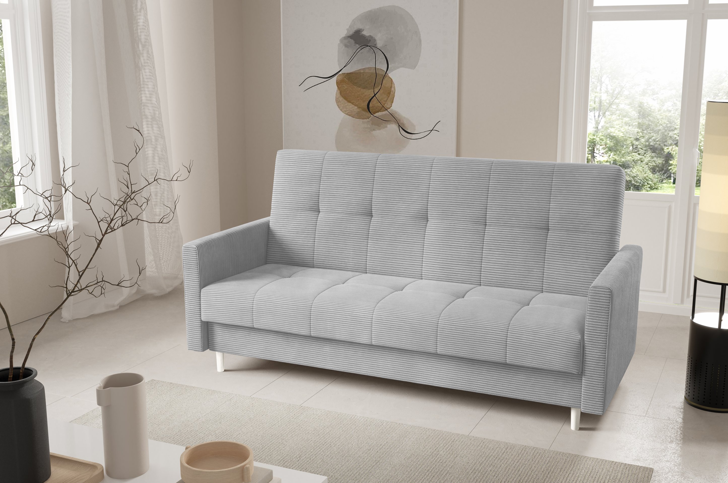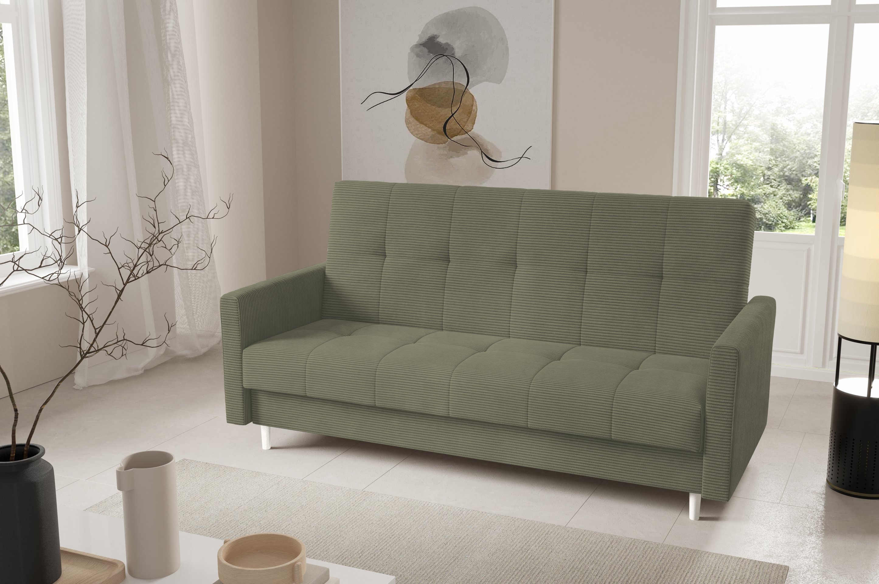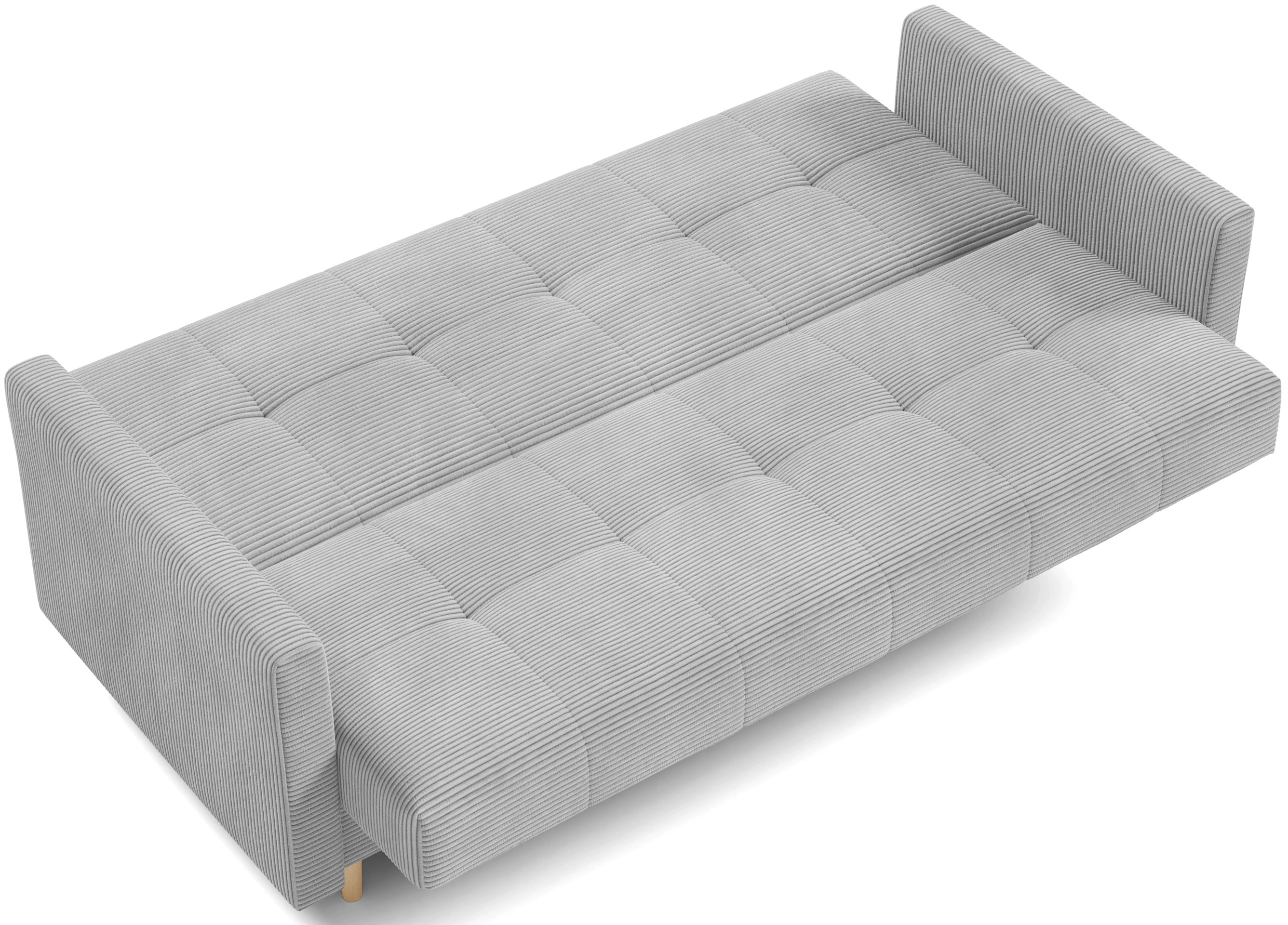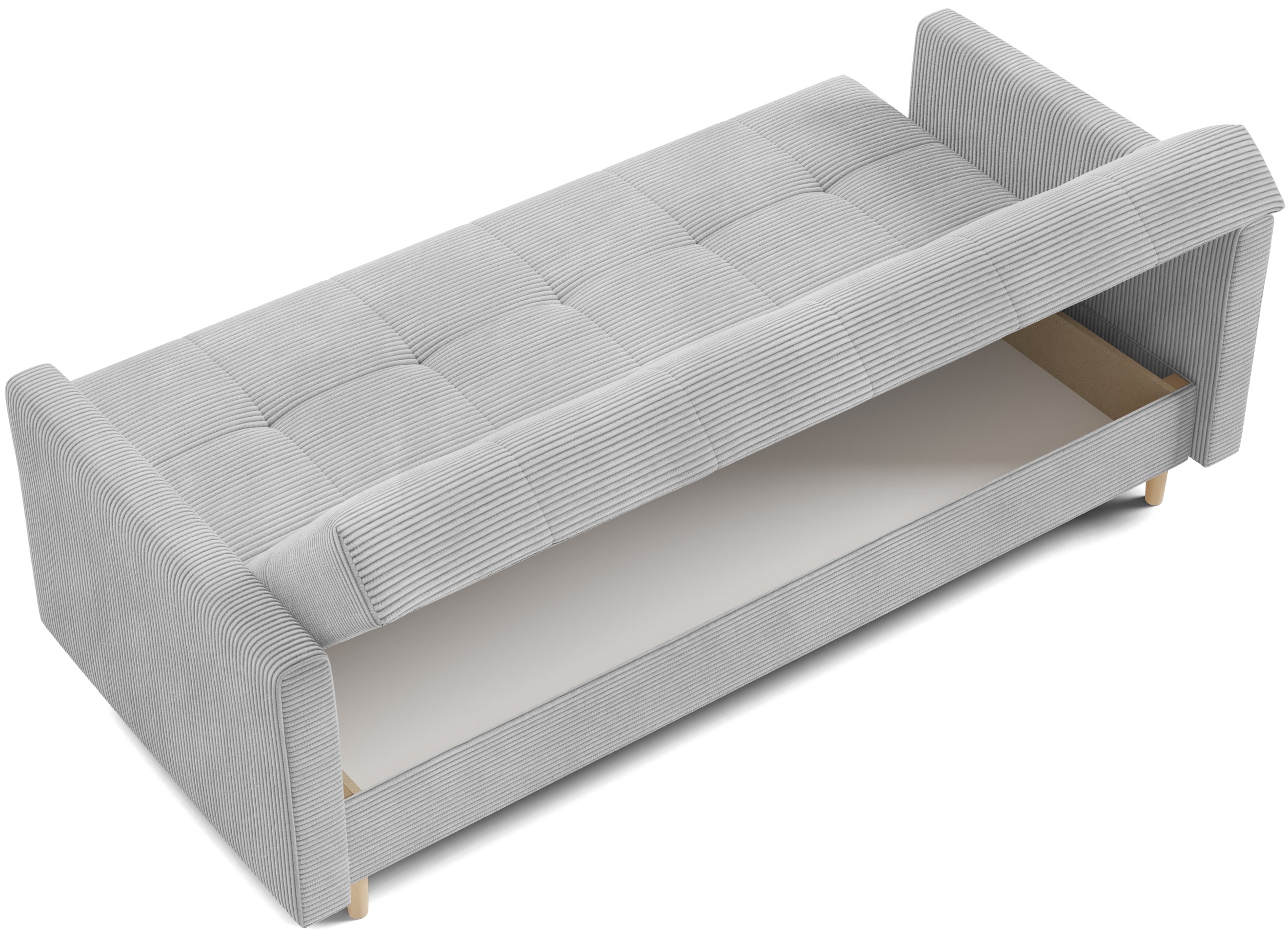 Osim funkcije spavanja, trosjed ima i prostranu ladicu za posteljinu koja se nalazi ispod sjedećeg dijela. Ovo praktično rješenje omogućuje pohranu deka, jastuka ili drugih tekstilnih dodataka, čime se održava red i čist izgled prostora. Ladica je jednostavno dostupna i ne zahtijeva poseban napor pri otvaranju.