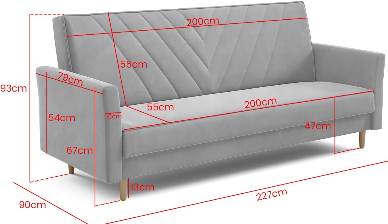 Trosjed Sven marke PKMebel je moderan komad tapeciranog namještaja koji spaja funkcionalnost, jednostavan oblik i kvalitetnu izradu. S dimenzijama 227x90x93 cm nudi dovoljno prostora za udobno sjedenje tijekom dana, a navečer se jednostavnim klik klak mehanizmom pretvara u ugodan ležaj dimenzija 110x200 cm. Takav sustav omogućuje brzo i bez napora preoblikovanje sjedećeg dijela u krevet, što je idealno za svakodnevnu upotrebu ili povremeno prenoćište gostiju.