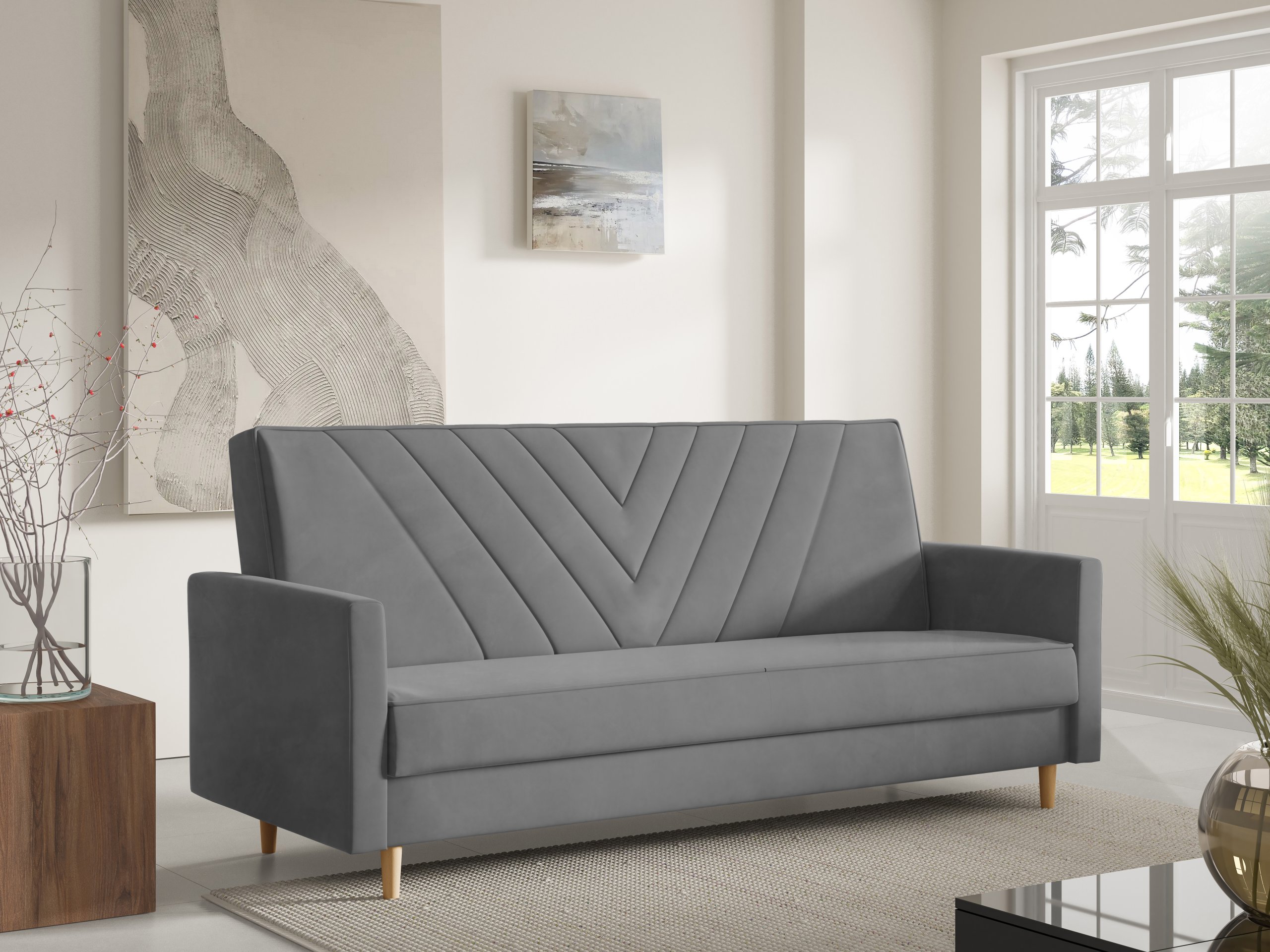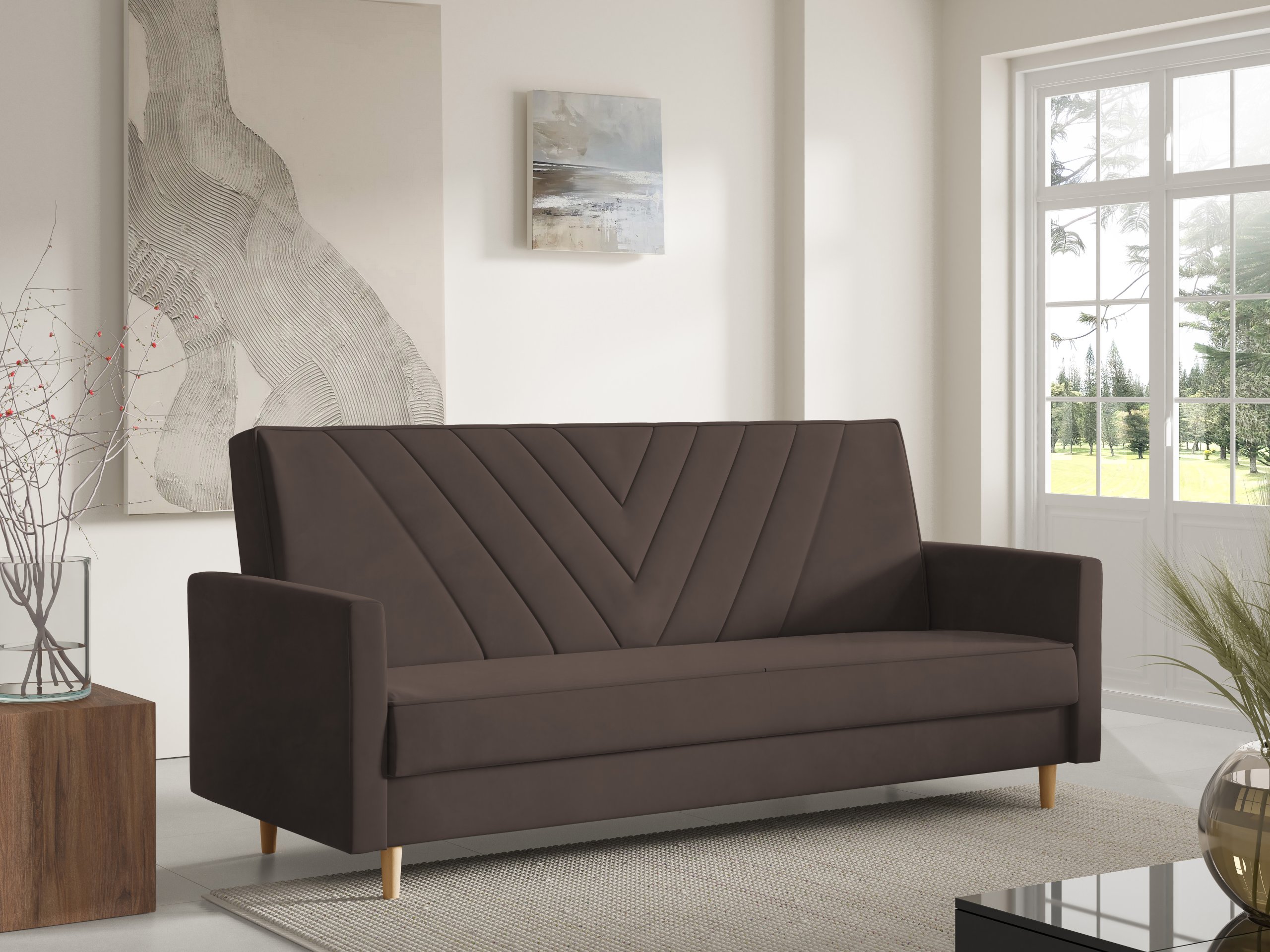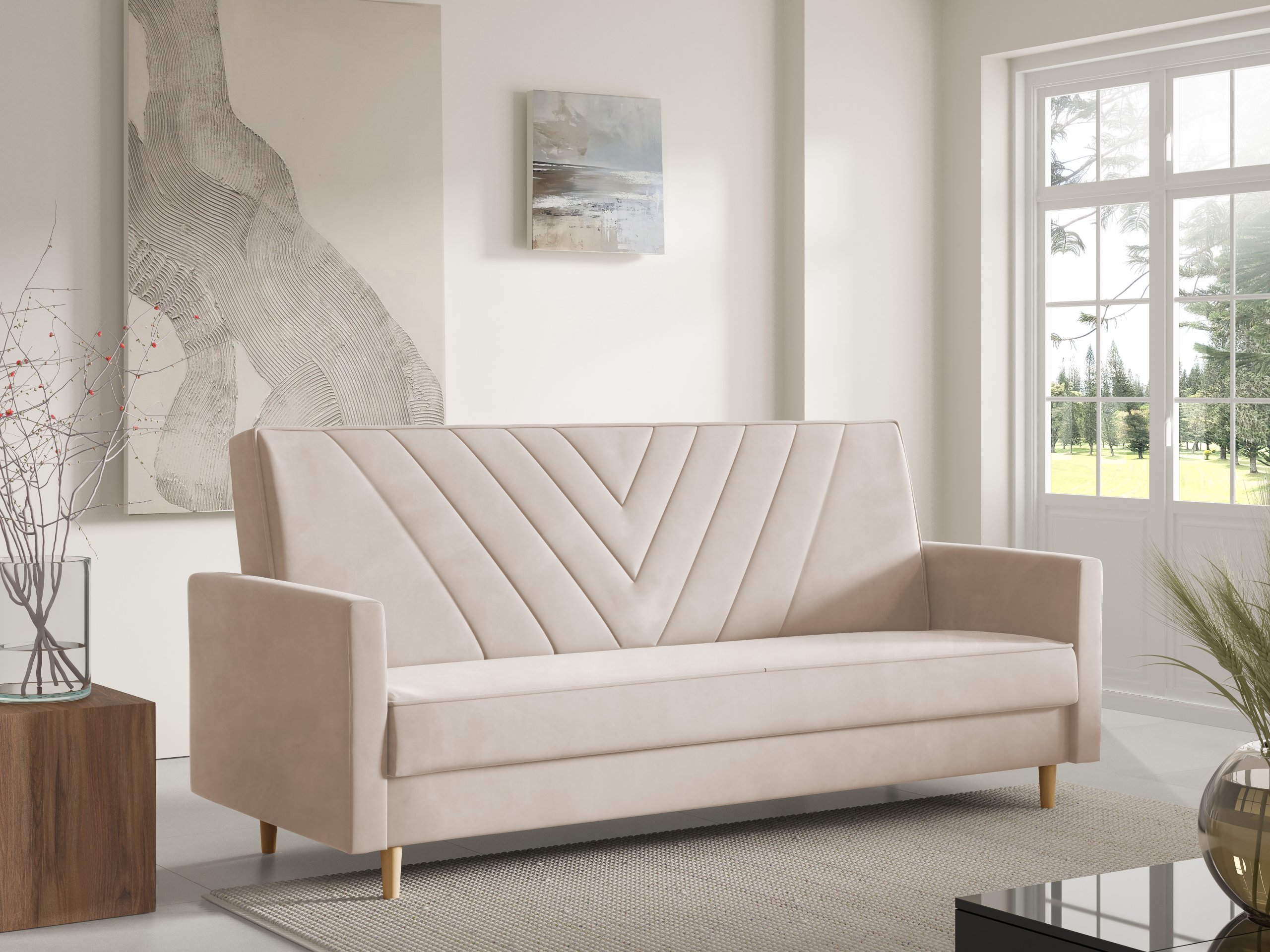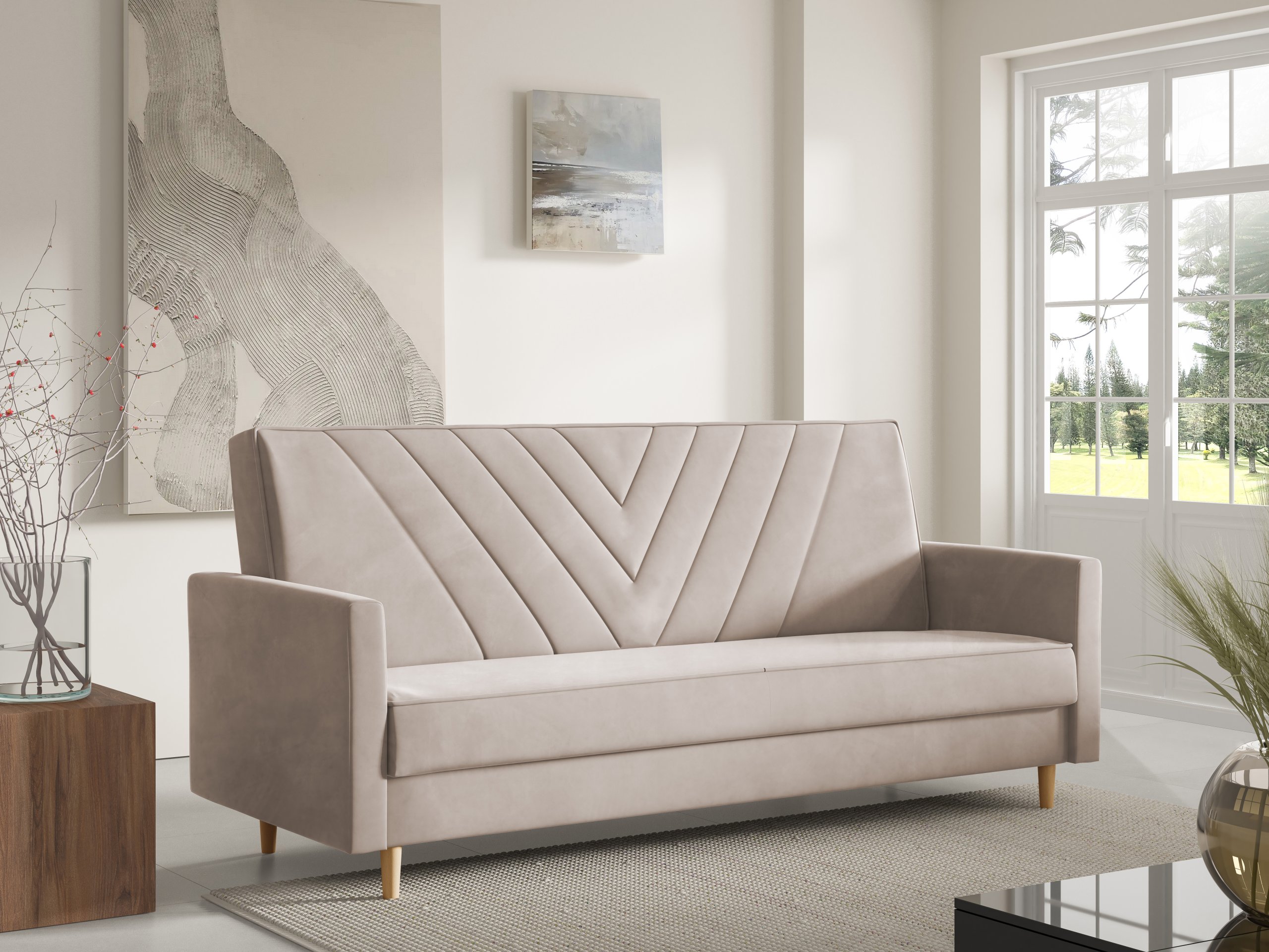 Sven je dizajniran s jednostavnim, ali profinjenim linijama. Možete birati između različitih boja izvedbi nogica – prirodna, bijela ili crna – što omogućuje dodatnu prilagodbu izgledu vašeg prostora. Zbog pročišćenog oblika i kompaktnih dimenzija, trosjed se lijepo uklapa u dnevne sobe, garsonijere ili sobe za goste.