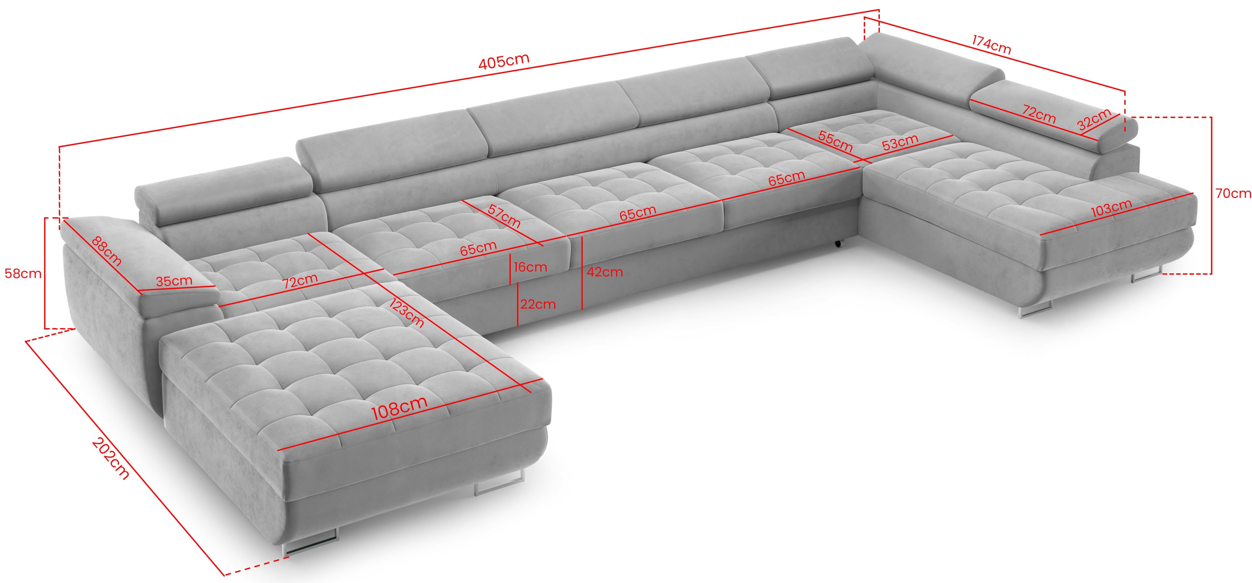 Kutna garnitura Benjamin 275 XL donosi savršenu ravnotežu između suvremene estetike i funkcionalne udobnosti. Riječ je o prostranoj kutnoj garnituri u obliku slova U, koja sa svojim dimenzijama 405x202x70 cm omogućuje udobno sjedenje više osoba istovremeno. Izrađena je u tvornici PKMebel u Poljskoj, što jamči provjerenu kvalitetu i preciznu izradu. Čvrst drveni okvir osigurava stabilnost, dok kvalitetna tkanina Kronos 31 pruža ugodan dodir i elegantan vizualni dojam.