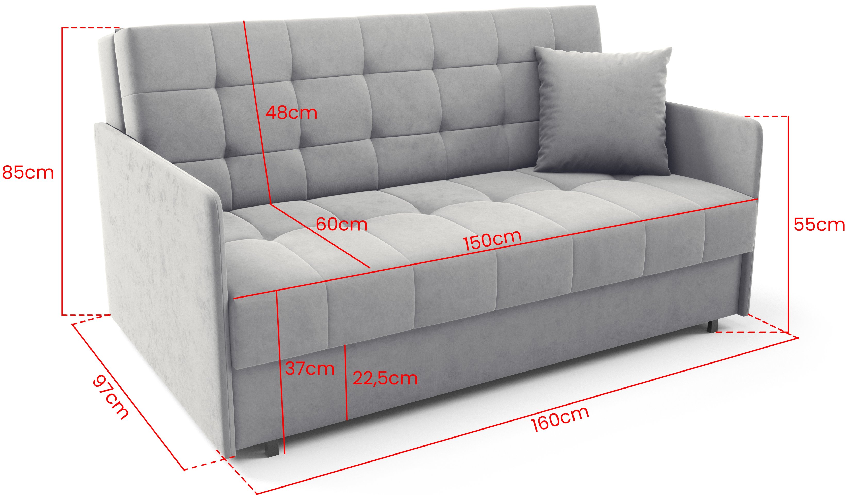 Posebna prednost modela je njegova kompaktna širina od 160 cm, koja omogućuje postavljanje i u manje prostore, a da se pritom ne izgubi osjećaj prostranosti. S visinom od 85 cm i dubinom od 97 cm zadržava uravnotežene proporcije, pa djeluje elegantno i suvremeno.